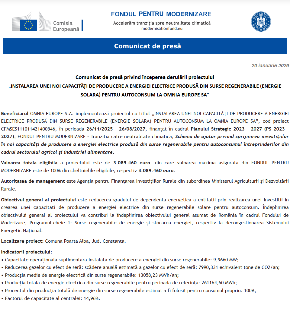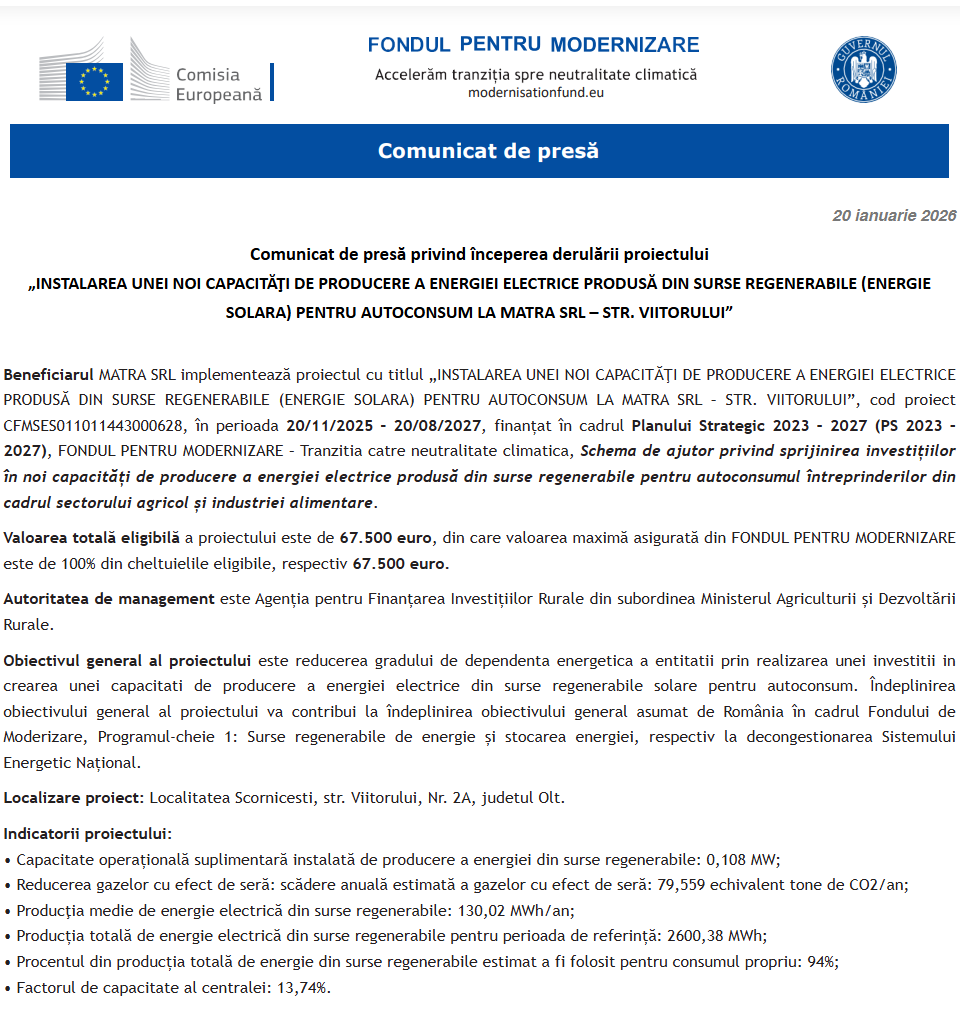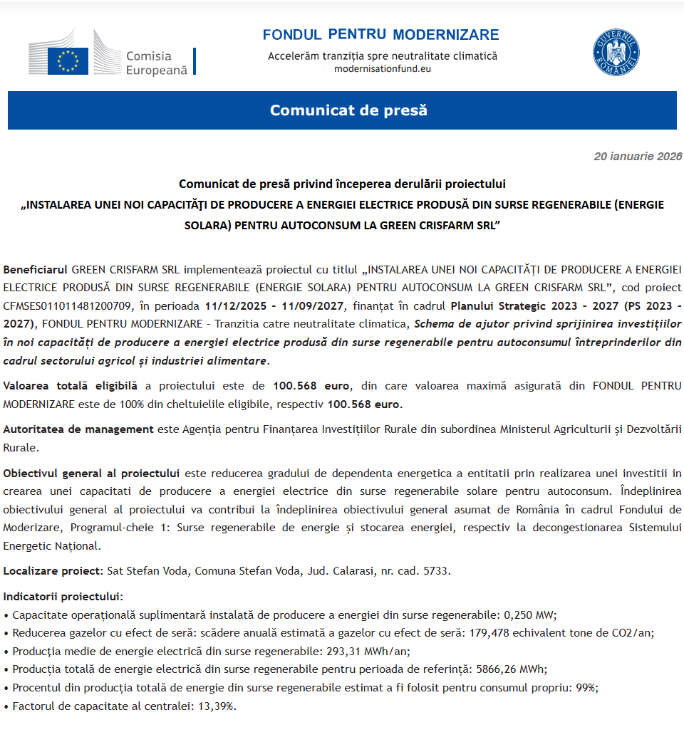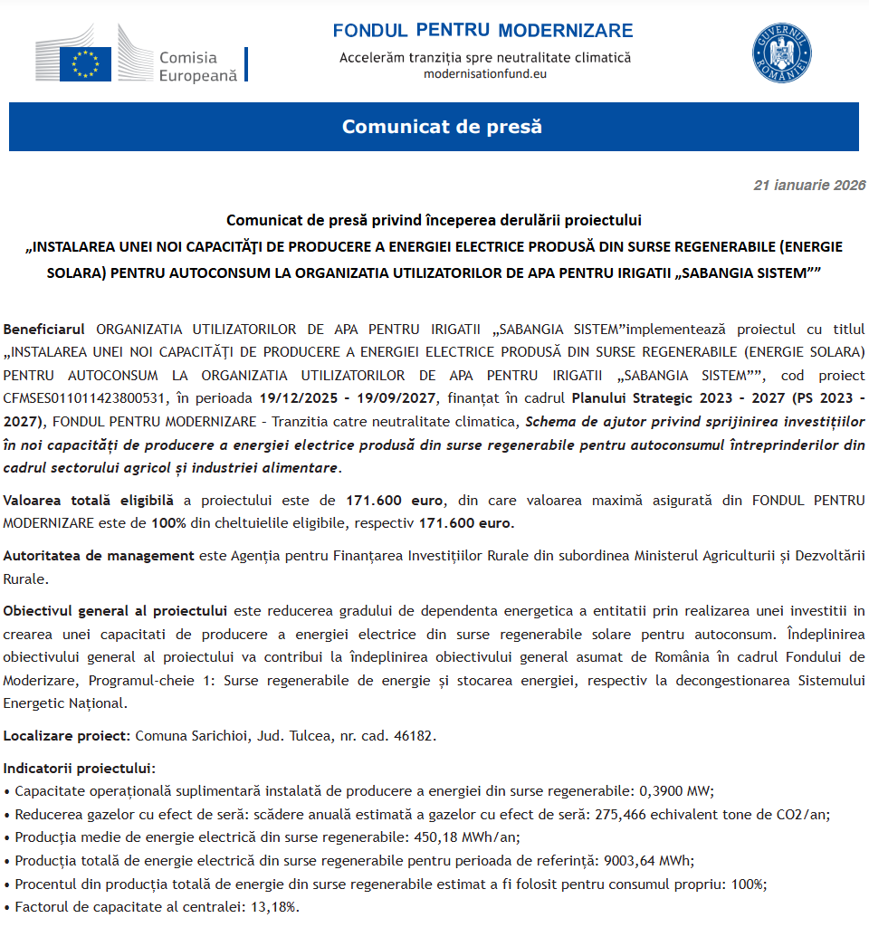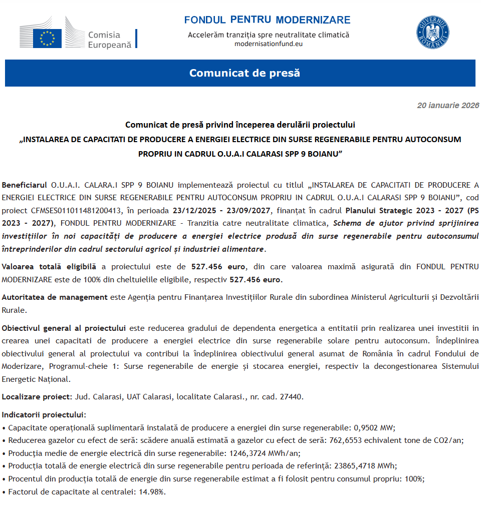 Comunicat de presă privind începerea derulării proiectului „INSTALAREA UNEI NOI CAPACITĂŢI DE PRODUCERE A ENERGIEI ELECTRICE PRODUSĂ DIN SURSE REGENERABILE (ENERGIE SOLARA) PENTRU AUTOCONSUM LA ORGANIZATIA UTILIZATORILOR DE APA PENTRU IRIGATII „SABANGIA SISTEM”” Comunicat de presă privind finalizarea derulării proiectului “Digitalizarea SC BLUE DENT SRL” Comunicat de presă privind începerea derulării proiectului „INSTALAREA UNEI NOI CAPACITĂŢI DE PRODUCERE A ENERGIEI ELECTRICE PRODUSĂ DIN SURSE REGENERABILE (ENERGIE SOLARA) PENTRU AUTOCONSUM LA OMNIA EUROPE SA” Comunicat de presă privind începerea derulării proiectului „Crearea unei unități de producție de foi din spumă de P.V.C. pentru societatea DNS’S PANEL SRL” Comunicat de presă privind începerea derulării proiectului „INSTALAREA UNEI NOI CAPACITĂŢI DE PRODUCERE A ENERGIEI ELECTRICE PRODUSĂ DIN SURSE REGENERABILE (ENERGIE SOLARA) PENTRU AUTOCONSUM LA MATRA SRL – STR. VIITORULUI” Comunicat de presă privind începerea derulării proiectului „INSTALAREA UNEI NOI CAPACITĂŢI DE PRODUCERE A ENERGIEI ELECTRICE PRODUSĂ DIN SURSE REGENERABILE (ENERGIE SOLARA) PENTRU AUTOCONSUM LA GREEN CRISFARM SRL” Comunicat de presă privind începerea derulării proiectului „INSTALAREA UNEI NOI CAPACITĂŢI DE PRODUCERE A ENERGIEI ELECTRICE PRODUSĂ DIN SURSE REGENERABILE (ENERGIE SOLARA) PENTRU AUTOCONSUM LA BIOAVILEX SRL” Comunicat de presă privind începerea derulării proiectului „INSTALAREA DE CAPACITATI DE PRODUCERE A ENERGIEI ELECTRICE DIN SURSE REGENERABILE PENTRU AUTOCONSUM PROPRIU IN CADRUL O.U.A.I CALARASI SPP 9 BOIANU” Comunicat de presă privind începerea derulării proiectului „INSTALAREA DE CAPACITATI DE PRODUCERE A ENERGIEI ELECTRICE DIN SURSE REGENERABILE PENTRU AUTOCONSUM PROPRIU IN CADRUL O.U.A.I. CUNESTI SPP 3+4 BOIANU” Pagina 10 din 215‹Anterioară12345678910111213141516171819‹Următoare »Ultima pagină Publică Anunţ