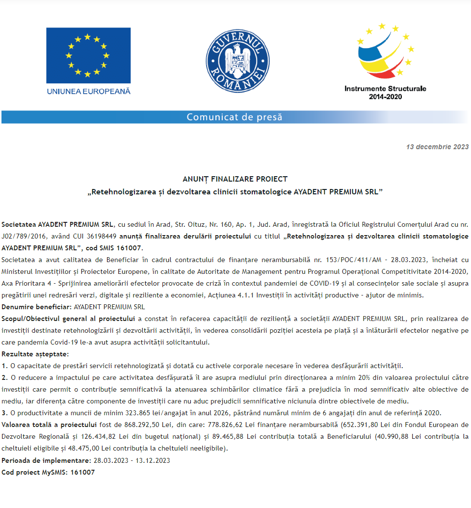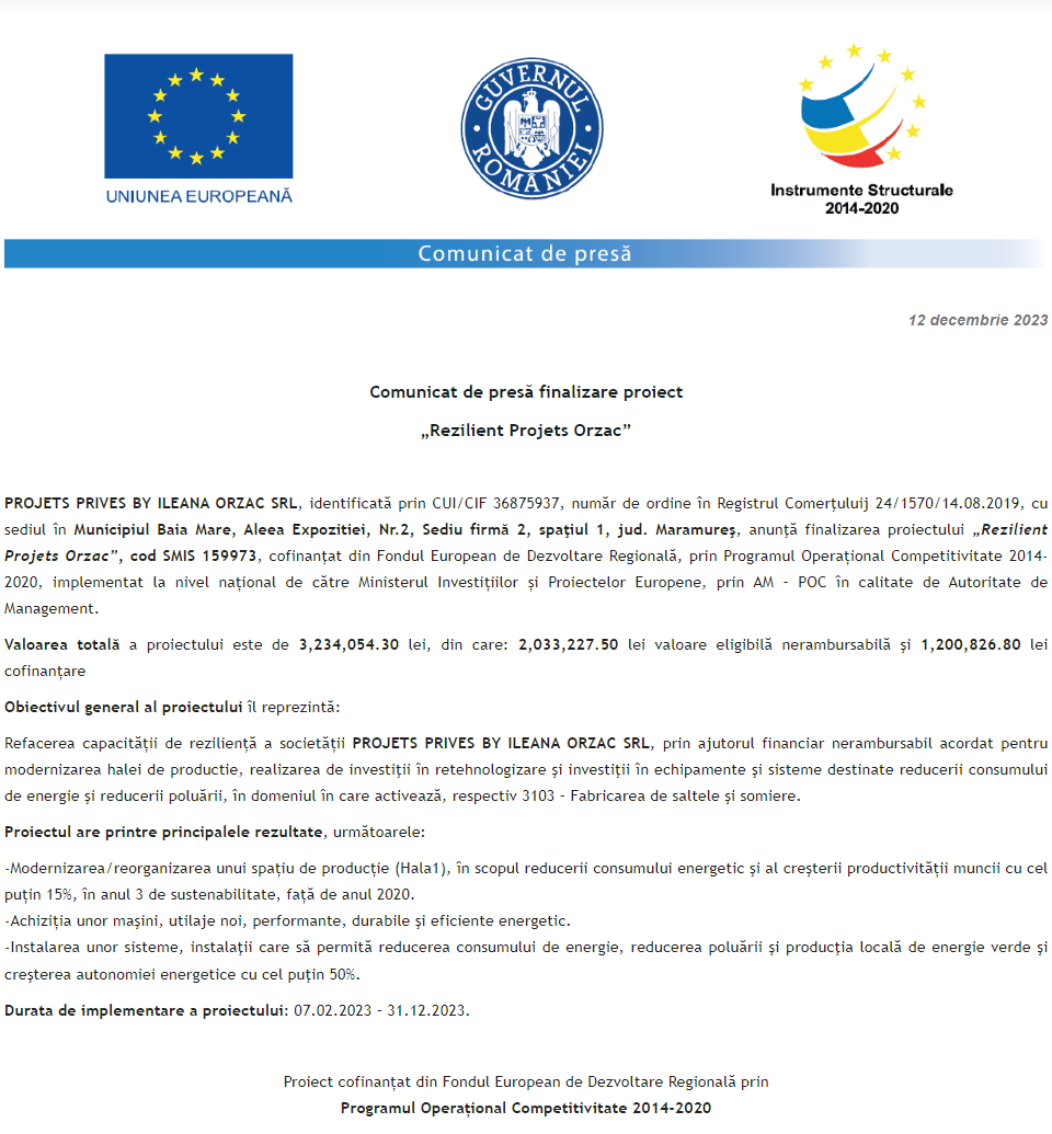 Comunicat de presă privind finalizarea derulării proiectului „Achiziție de utilaje pentru retehnologizarea SC Torn HVAC Solutions SRL” Comunicat de presă privind finalizarea derulării proiectului „Achiziție de echipamente în cadrul Smile Art Dental Lab SRL” Comunicat de presă privind finalizarea derulării proiectului „Achiziția de echipamente in cadrul Industry One Trading SRL” Comunicat de presă privind finalizarea derulării proiectului „Retehnologizarea și dezvoltarea clinicii stomatologice AYADENT PREMIUM SRL” Comunicat de presă privind finalizarea derulării proiectului „Rezilient Projets Orzac” Comunicat de presă privind finalizarea derulării proiectului „Investitii in sistem de panouri fotovoltaice si solutii electrice de manipulare” Comunicat de presă privind inceperea derulării proiectului „DOTARE SC SOL ELECTRIC PROJECTS SRL CU UN AUTOVEHICUL ELECTRIC SI UN PACHET DIGITAL” Comunicat de presă privind finalizarea derulării proiectului „Investiții în retehnologizare destinate suplimentării capacităţilor de depozitare cereale existente în cadrul companiei EVEL-H COMPANY” Comunicat de presă privind finalizarea derulării proiectului „DEZVOLTAREA SOCIETATII DUAL AD CONSTRUCT SRL” Pagina 107 din 215«Prima pagină‹Anterioară9899100101102103104105106107108109110111112113114115116‹Următoare »Ultima pagină Publică Anunţ