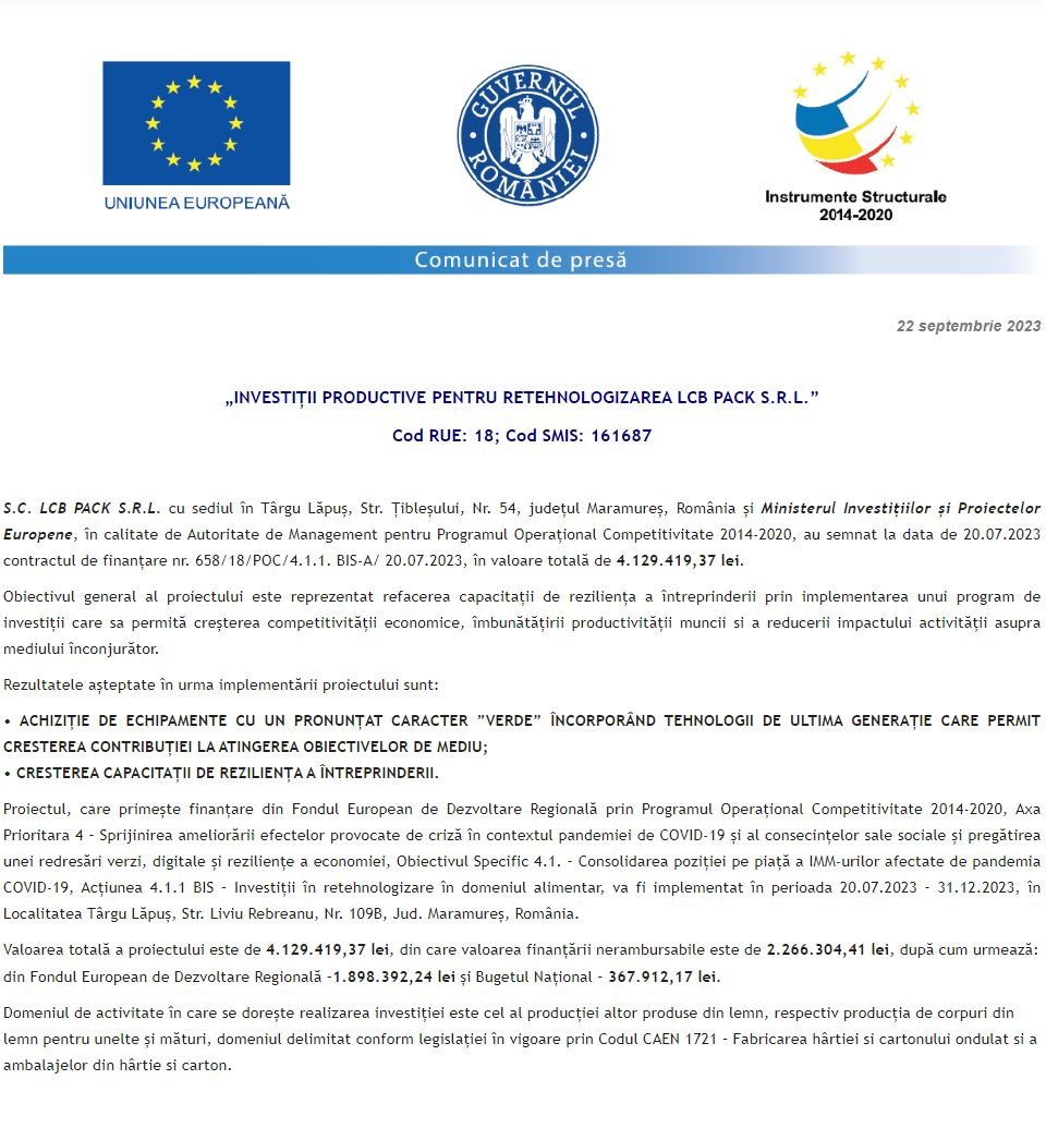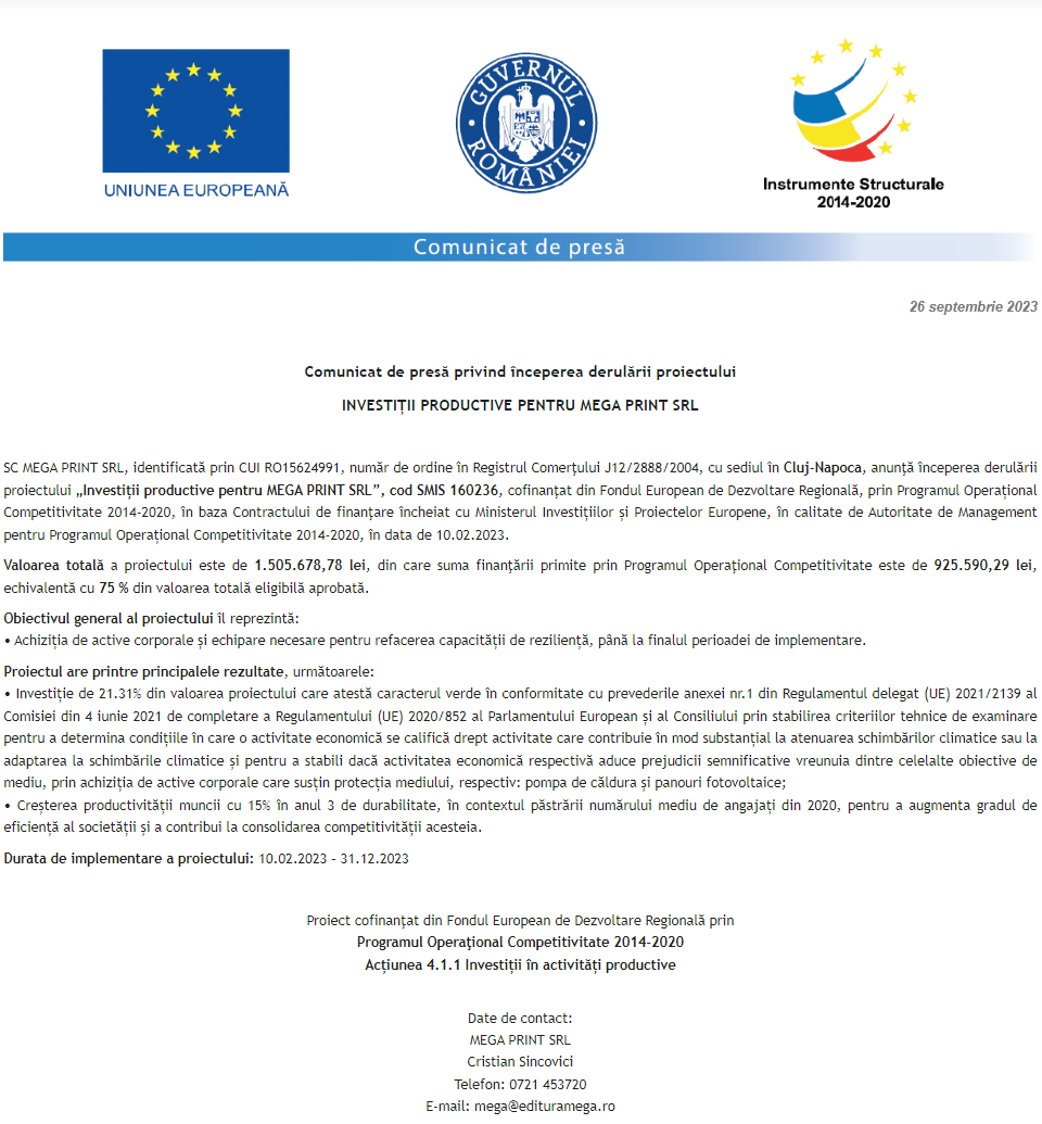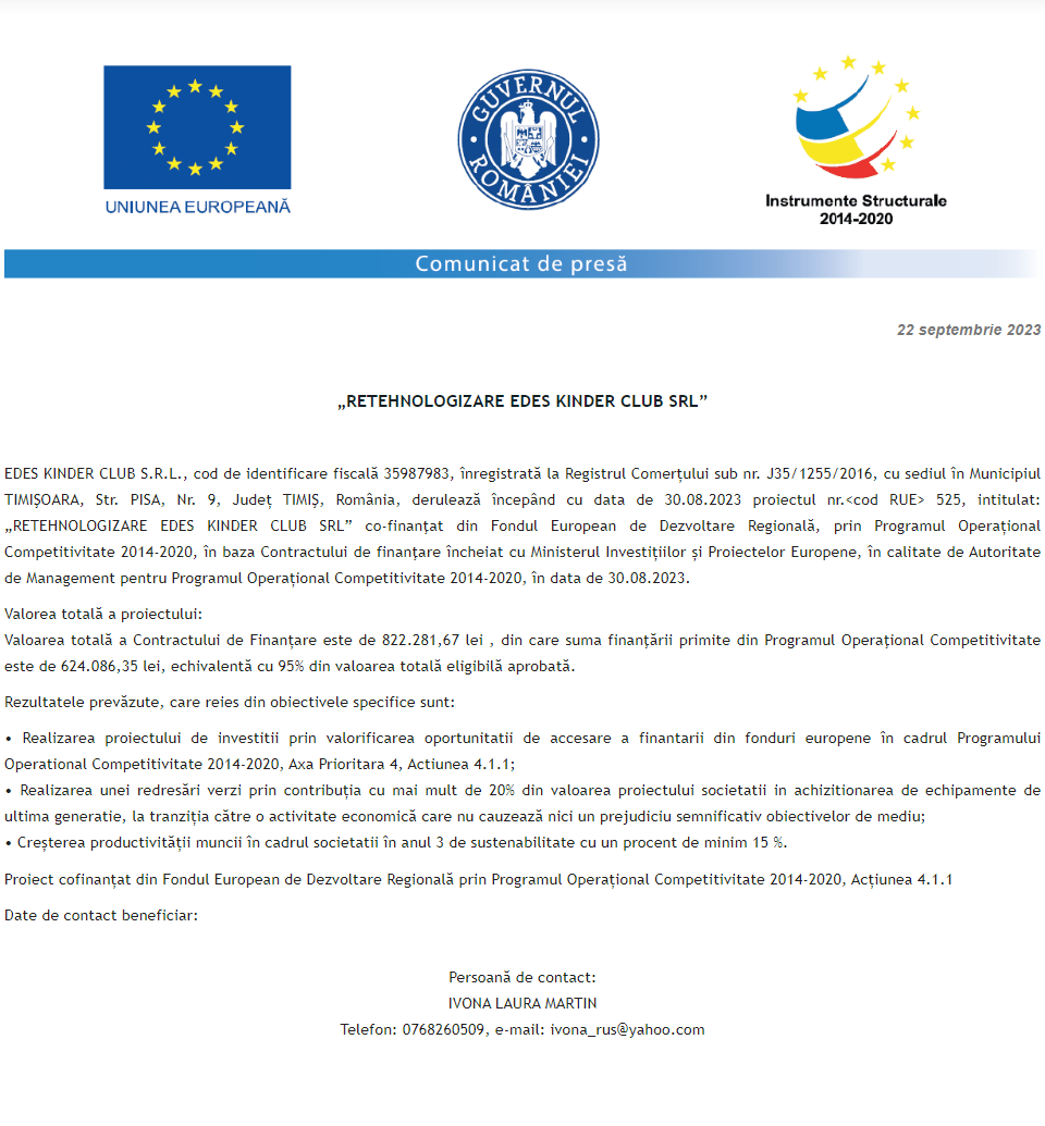 Anunț de participare pentru selecția de oferte in vederea atribuirii contractului de achizitii al societatii SC RIMAN TEN SRL Comunicat de presă privind finalizarea derulării proiectului „Consolidarea poziției pe piață prin retehnologizarea societății FORAJE ONDRILL SRL, în vederea refacerii capacității de reziliență” Comunicat de presă privind începerea derulării proiectului „Achiziția de echipamente necesare pentru obținerea de energie din surse regenerabile” Comunicat de presă privind începerea derulării proiectului „INVESTIȚII PRODUCTIVE PENTRU MEGA PRINT SRL” Comunicat de presă privind începerea derulării proiectului „RETEHNOLOGIZARE EDES KINDER CLUB SRL” Comunicat de presă privind începerea derulării proiectului „RETEHNOLOGIZARE EDES KINDER CLUB SRL” Comunicat de presă privind începerea derulării proiectului „DOTAREA CU MOBILIER, MATERIALE DIDACTICE SI ECHIPAMENTE DIGITALE A UNITATILOR DE INVATAMANT DIN COMUNA POIENILE IZEI, JUD MARAMURES” Comunicat de presă privind începerea derulării proiectului „INVESTIȚII PRODUCTIVE PENTRU RETEHNOLOGIZAREA LCB PACK S.R.L.” Comunicat de presă privind începerea derulării proiectului „RETEHNOLOGIZARE EDES KINDER CLUB SRL” Pagina 109 din 215«Prima pagină‹Anterioară100101102103104105106107108109110111112113114115116117118‹Următoare »Ultima pagină Publică Anunţ