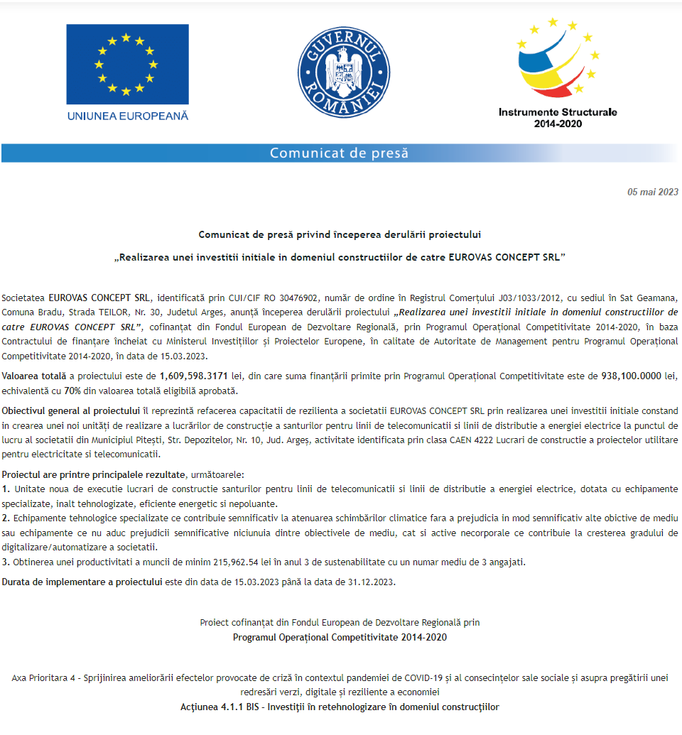 Anunț privind finalizarea derulării proiectului Grant capital de lucru AGRI-FOOD acordat beneficiarului DARCOKE PAN S.R.L. Anunț privind finalizarea derulării proiectului Grant capital de lucru AGRI-FOOD acordat beneficiarului S.C. EPINEX S.R.L. Anunț privind finalizarea derulării proiectului Grant capital de lucru AGRI-FOOD acordat beneficiarului KOSTYSEMIN KRAFT S.R.L. Anunt procedura achizitie servicii de proiectare studiu fezabilitate TERRA SILVA SRL Anunț privind finalizarea derulării proiectului Grant capital de lucru AGRI-FOOD acordat beneficiarului TOM CRIS HOTELS S.R.L. Comunicat de presă privind începerea derulării proiectului „Realizarea unei investitii initiale in domeniul constructiilor de catre EUROVAS CONCEPT GRUP SRL” Anunț privind finalizarea derulării proiectului Grant capital de lucru AGRI-FOOD acordat beneficiarului S.C. SUPREMOFFICE S.R.L. Anunț privind finalizarea derulării proiectului Grant capital de lucru AGRI-FOOD acordat beneficiarului S.C. AGROLIV YMP S.R.L. Anunț privind finalizarea derulării proiectului Grant capital de lucru AGRI-FOOD acordat beneficiarului S.C. ZEA S.R.L. Pagina 121 din 215«Prima pagină‹Anterioară112113114115116117118119120121122123124125126127128129130‹Următoare »Ultima pagină Publică Anunţ