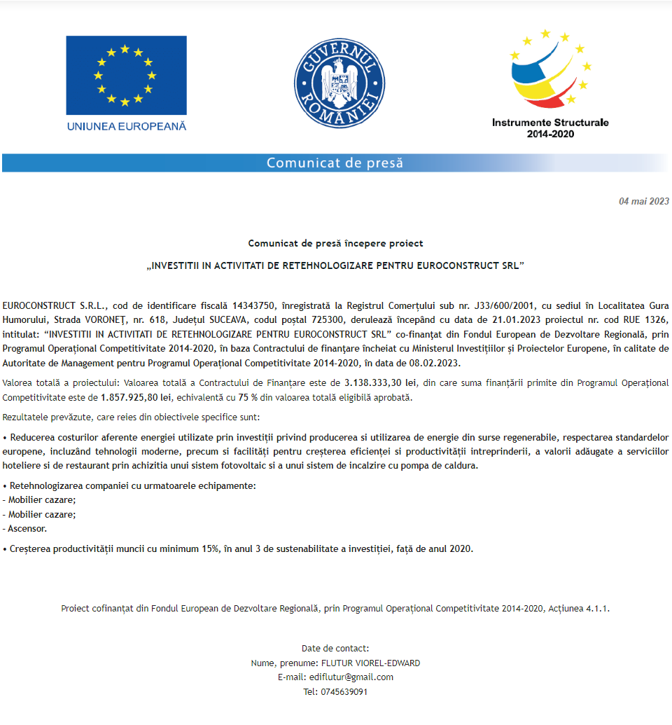 Anunț privind finalizarea derulării proiectului Grant capital de lucru AGRI-FOOD acordat beneficiarului MALU COMPREST S.R.L. Anunț privind finalizarea derulării proiectului Grant capital de lucru AGRI-FOOD acordat beneficiarului SC ZAVOAGRI SRL Anunț privind finalizarea derulării proiectului Grant capital de lucru AGRI-FOOD acordat beneficiarului CRALUPVAS S.R.L. Anunț privind finalizarea derulării proiectului Grant capital de lucru AGRI-FOOD acordat beneficiarului GUSTĂRI SAVUROASE S.R.L. Anunț privind finalizarea derulării proiectului Grant capital de lucru AGRI-FOOD acordat beneficiarului AGROFINANCE GROUP S.R.L. Comunicat de presă privind începerea derulării proiectului „INVESTITII IN ACTIVITATI DE RETEHNOLOGIZARE PENTRU EUROCONSTRUCT SRL” Anunț privind finalizarea derulării proiectului Grant capital de lucru AGRI-FOOD acordat beneficiarului PAN AGRO VIC S.R.L. Anunț privind finalizarea derulării proiectului Grant capital de lucru AGRI-FOOD acordat beneficiarului RENARD OLUNDEN S.R.L. Anunț privind finalizarea derulării proiectului Grant capital de lucru AGRI-FOOD acordat beneficiarului FOODSCA S.R.L. Pagina 123 din 215«Prima pagină‹Anterioară114115116117118119120121122123124125126127128129130131132‹Următoare »Ultima pagină Publică Anunţ