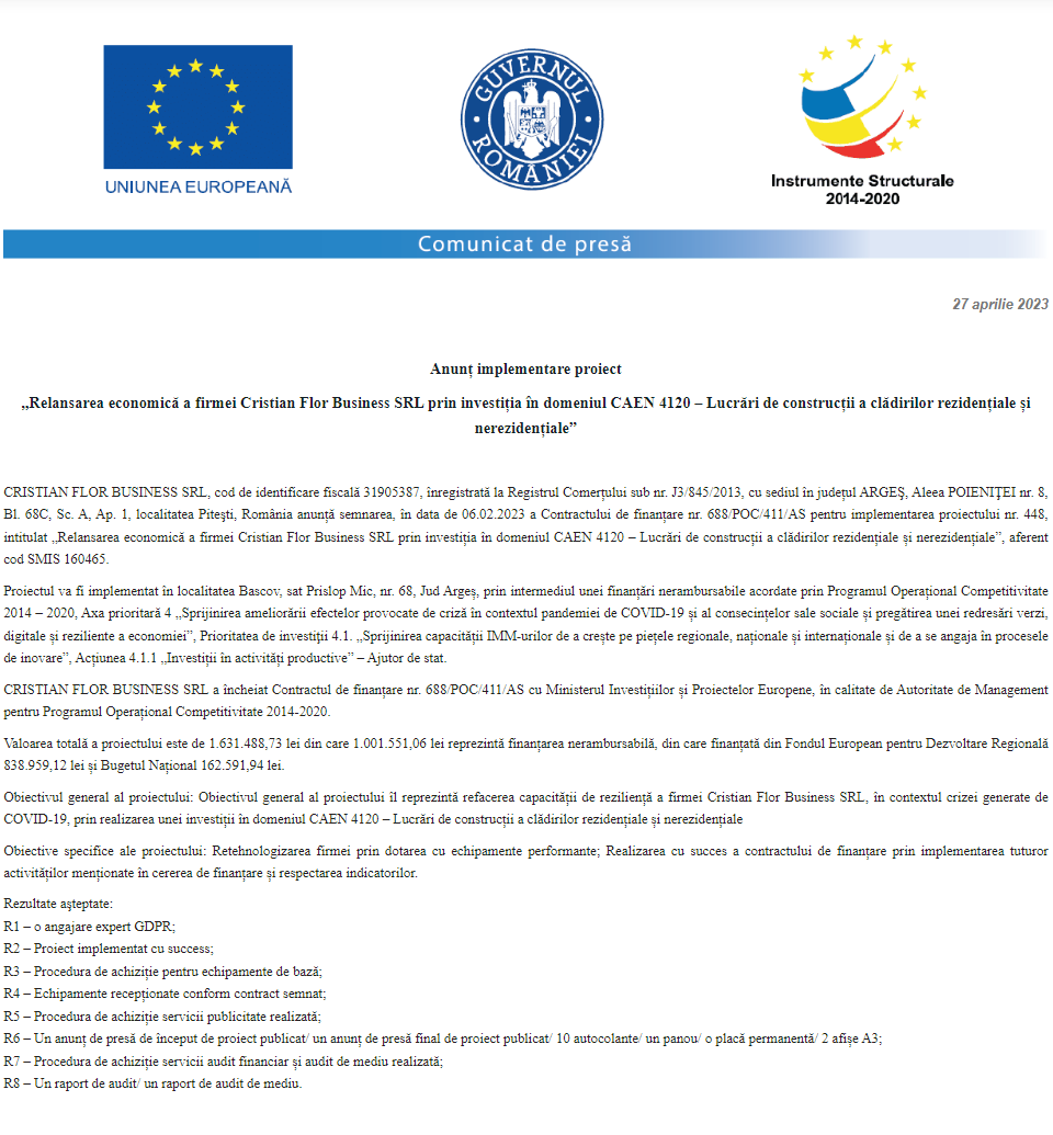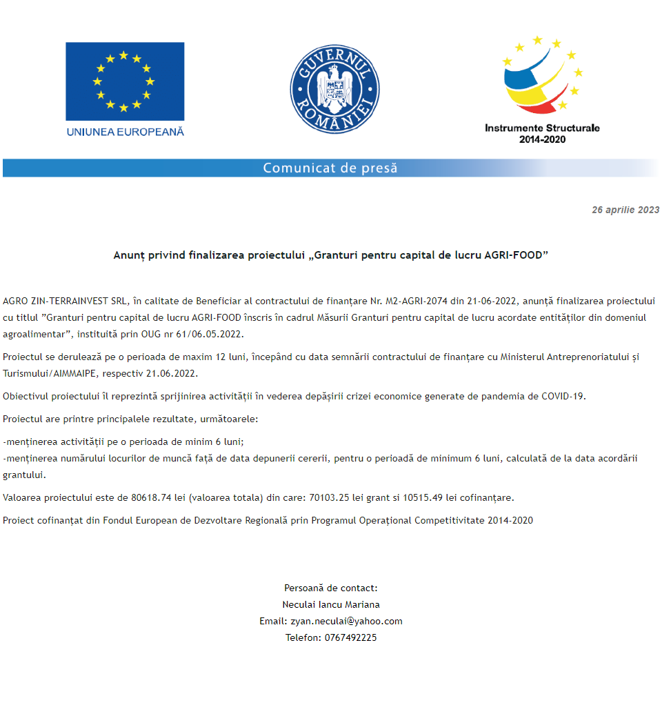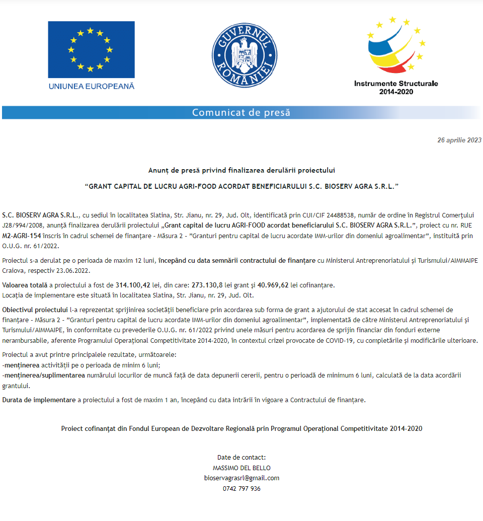 Comunicat de presă privind începerea derulării proiectului „Relansarea economică a firmei Cristian Flor Business SRL prin investiția în domeniul CAEN 4120 – Lucrări de construcții a clădirilor rezidențiale și nerezidențiale” Anunț privind finalizarea derulării proiectului Grant capital de lucru AGRI-FOOD acordat beneficiarului CEREAL AGROTECH VISION SRL Anunț privind finalizarea derulării proiectului Grant capital de lucru AGRI-FOOD acordat beneficiarului S.C. BV ART CONSTRUCT S.R.L. Anunț privind finalizarea derulării proiectului Grant capital de lucru AGRI-FOOD acordat beneficiarului PIREMI S.R.L. Anunț privind finalizarea derulării proiectului Grant capital de lucru AGRI-FOOD acordat beneficiarului S.C. DOVLEACUL ARŢĂGOS S.R.L. Anunț privind finalizarea derulării proiectului Grant capital de lucru AGRI-FOOD acordat beneficiarului AGRO ZIN-TERRAINVEST SRL Anunț privind finalizarea derulării proiectului Grant capital de lucru AGRI-FOOD acordat beneficiarului SC SORANTIS TFM SRL Anunț privind finalizarea derulării proiectului Grant capital de lucru AGRI-FOOD acordat beneficiarului LA TARTERIE SRL Anunț privind finalizarea derulării proiectului Grant capital de lucru AGRI-FOOD acordat beneficiarului S.C. BIOSERV AGRA S.R.L. Pagina 128 din 215«Prima pagină‹Anterioară119120121122123124125126127128129130131132133134135136137‹Următoare »Ultima pagină Publică Anunţ