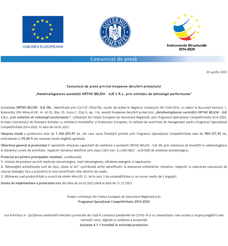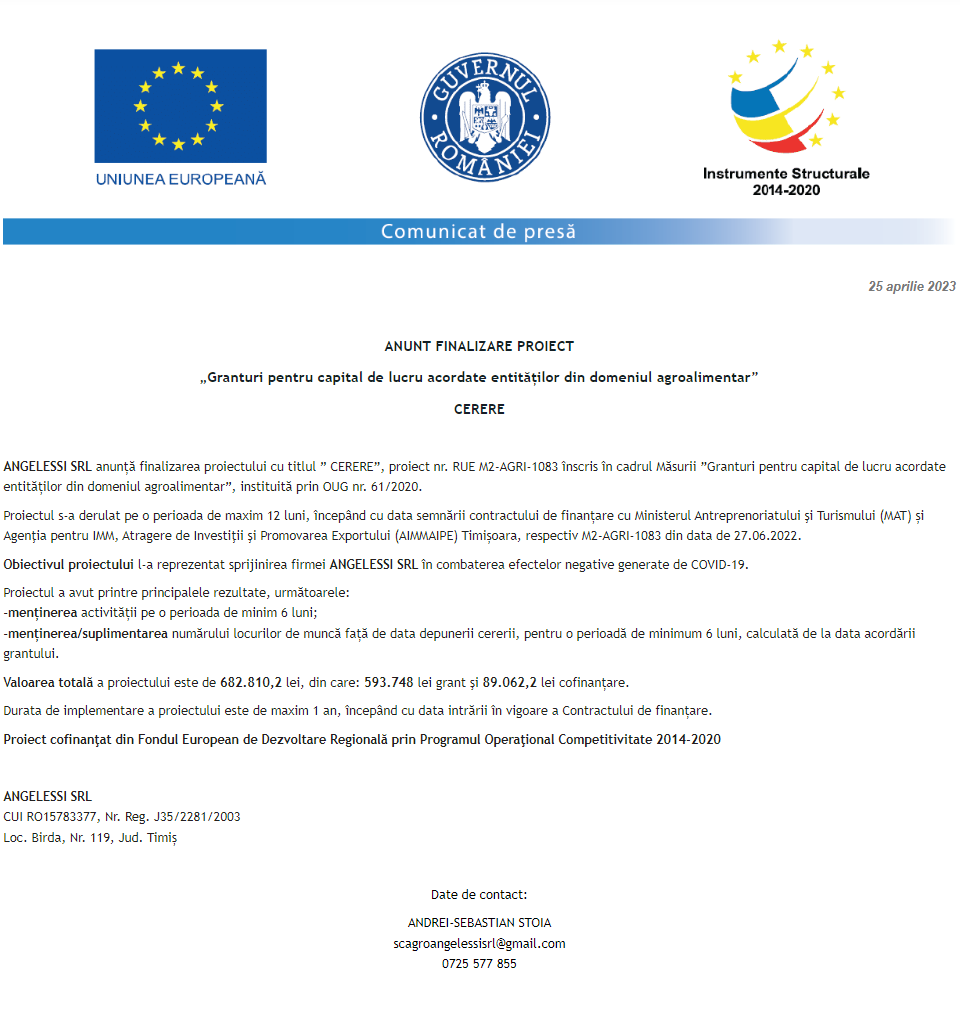 Anunț privind finalizarea derulării proiectului Grant capital de lucru AGRI-FOOD acordat beneficiarului SC GEADA SA Anunț privind finalizarea derulării proiectului Grant capital de lucru AGRI-FOOD acordat beneficiarului S.C. SIMA PROD S.R.L. Comunicat de presă privind începerea derulării proiectului „Retehnologizarea societății ORTHO BELENI – ILIE S.R.L. prin achiziția de tehnologii performante” Anunț privind finalizarea derulării proiectului Grant capital de lucru AGRI-FOOD acordat beneficiarului AGROCHIM S.R.L. Anunț privind finalizarea derulării proiectului Grant capital de lucru AGRI-FOOD acordat beneficiarului S.C. APOLLO 13 S.R.L. Comunicat de presă privind începerea derulării proiectului „Consolidarea poziției pe piață prin retehnologizarea societății FORMPLAST DESIGN SRL, în vederea refacerii capacității de reziliență” Anunț privind finalizarea derulării proiectului Grant capital de lucru AGRI-FOOD acordat beneficiarului S.C. COFETĂRIA ANDALUSIA S.R.L. Anunț privind finalizarea derulării proiectului Grant capital de lucru AGRI-FOOD acordat beneficiarului S.C. AGRO ANGELESSI S.R.L. Anunț privind finalizarea derulării proiectului Grant capital de lucru AGRI-FOOD acordat beneficiarului S.C. ANGELESSI S.R.L. Pagina 129 din 215«Prima pagină‹Anterioară120121122123124125126127128129130131132133134135136137138‹Următoare »Ultima pagină Publică Anunţ