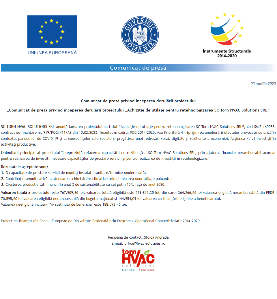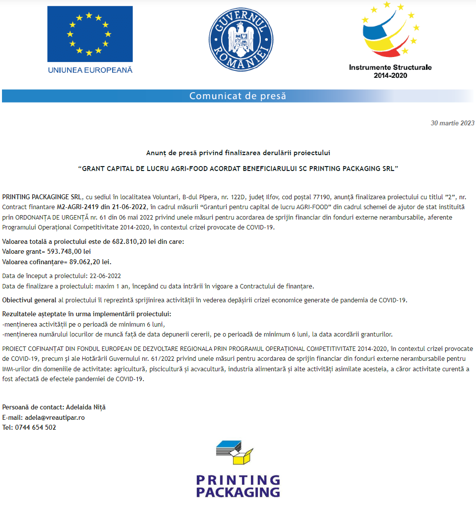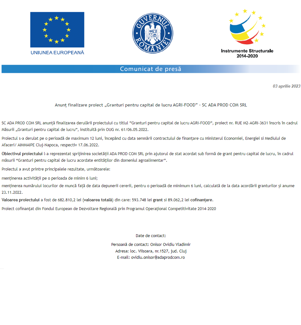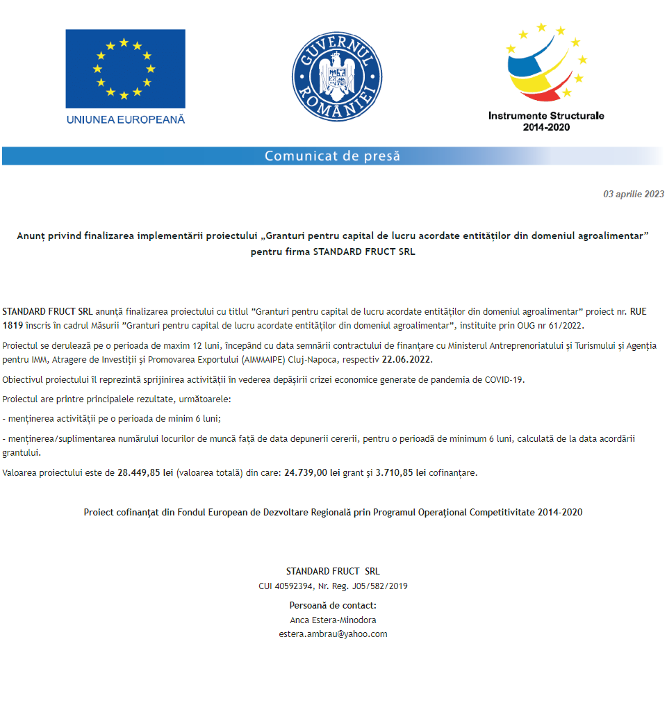 Comunicat de presă privind începerea derulării proiectului „DEZVOLTAREA CAPACITATII DE PRESTARE A SERVICIILOR STOMATOLOGICE IN CADRUL SOCIETATII MUNTEAN DENT SRL” Anunț privind finalizarea derulării proiectului Grant capital de lucru AGRI-FOOD acordat beneficiarului ADA PROD COM S.R.L. Comunicat de presă privind începerea derulării proiectului „Achiziție de utilaje pentru retehnologizarea SC Torn HVAC Solutions SRL” Anunț privind finalizarea derulării proiectului Grant capital de lucru AGRI-FOOD acordat beneficiarului AGROCOM-VIT 2002 S.R.L. Anunț privind finalizarea derulării proiectului Grant capital de lucru AGRI-FOOD acordat beneficiarului STANDARD FRUCT S.R.L. Comunicat de presă privind începerea derulării proiectului „INVESTITII IN ACTIVITATI PRODUCTIVE LA SC DIVIZIA TOP SRL” Anunț privind finalizarea derulării proiectului GRANT CAPITAL DE LUCRU AGRI-FOOD ACORDAT BENEFICIARULUI KILLER S.R.L. Comunicat de presă privind începerea derulării proiectului „Solar energy solution for a greener and healthier future” Anunț privind finalizarea derulării proiectului Grant capital de lucru AGRI-FOOD acordat beneficiarului SC PRINTING PACKAGING SRL Pagina 137 din 215«Prima pagină‹Anterioară128129130131132133134135136137138139140141142143144145146‹Următoare »Ultima pagină Publică Anunţ
