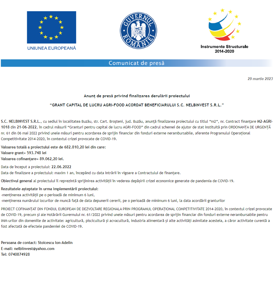 Anunț privind finalizarea derulării proiectului Grant capital de lucru AGRI-FOOD acordat beneficiarului S.C. NELBINVEST S.R.L. Comunicat de presă privind începerea derulării proiectului „Achizitie de echipamente pentru retehnologizarea SC ZEMPADAR CONSTRUCT SRL” Comunicat de presă privind începerea derulării proiectului „ACHIZITIE DE ECHIPAMENTE PENTRU RETEHNOLOGIZAREA SOCIETATII METENE SERVICE S.R.L” Comunicat de presă privind începerea derulării proiectului „Achizitie de echipamente pentru retehnologizarea SC INPROCONSA SRL” Comunicat de presă privind începerea derulării proiectului „ACHIZITIE DE ECHIPAMENTE PENTRU RETEHNOLOGIZAREA SC CRYSLYL COM SRL” Comunicat de presă privind începerea derulării proiectului „ACHIZITIE DE ECHIPAMENTE PENTRU RETEHNOLOGIZAREA SOCIETATII REBIX SRL” Anunț privind finalizarea derulării proiectului Grant capital de lucru AGRI-FOOD acordat beneficiarului COFETARIA PASAJ S.R.L. Comunicat de presă privind începerea derulării proiectului „Eficientizare și monitorizare consum energetic” Comunicat de presă privind începerea derulării proiectului „Eficientizare energetică în cadrul societăţii Silgimar Prod” Pagina 139 din 215«Prima pagină‹Anterioară130131132133134135136137138139140141142143144145146147148‹Următoare »Ultima pagină Publică Anunţ