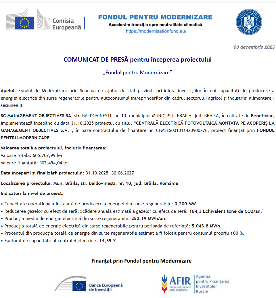Comunicat de presă privind finalizarea derulării proiectului “SPRIJIN PENTRU DIGITALIZAREA SOCIETĂȚII EVALUARE IMPACT SRL” Comunicat de presă privind începerea derulării proiectului “Înființare întreprindere socială în domeniul serviciilor de publicitate în mediul online” Comunicat de presă privind finalizarea derulării proiectului “PRO DIALOG SOCIAL”, Cod SMIS: 30868 Comunicat de presă privind finalizarea derulării proiectului „Reabilitare, modernizare și dotare scoala gimnazială “Ion Popescu Voiteștii” din comuna Bălănești, județul Gorj” Comunicat de presă privind începerea derulării proiectului „CENTRALĂ ELECTRICĂ FOTOVOLTAICĂ MONTATĂ PE ACOPERIȘ LA MANAGEMENT OBJECTIVES S.A.” Comunicat de presă privind finalizarea derulării proiectului „Reabilitare, modernizare și dotare scoala gimnazială “Ion Popescu Voiteștii” din comuna Bălănești, județul Gorj” Comunicat de presă privind începerea derulării proiectului „CENTRALĂ FOTOVOLTAICĂ MONTATĂ PE ACOPERIȘ LA VEL PITAR BRUTĂRIA CLUJ NAPOCA, 550KWP” Comunicat de presă privind finalizarea derulării proiectului „Reabilitare, modernizare și dotare scoala gimnazială “Ion Popescu Voiteștii” din comuna Bălănești, județul Gorj” Comunicat de presă privind finalizarea derulării proiectului „Modernizarea infrastructurii TIC si consolidarea prezentei digitale in cadrul Danco Pro Communication pentru o crestere sustenabila” Pagina 14 din 215«Prima pagină‹Anterioară567891011121314151617181920212223‹Următoare »Ultima pagină Publică Anunţ