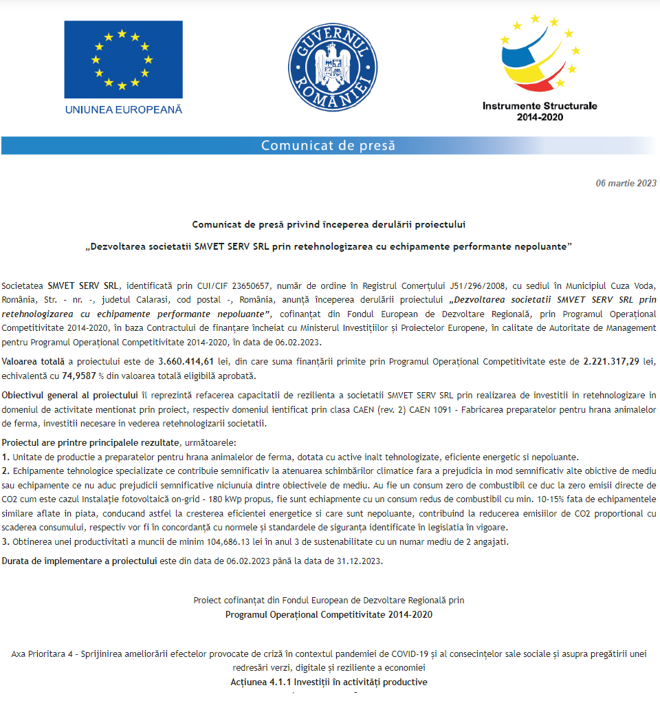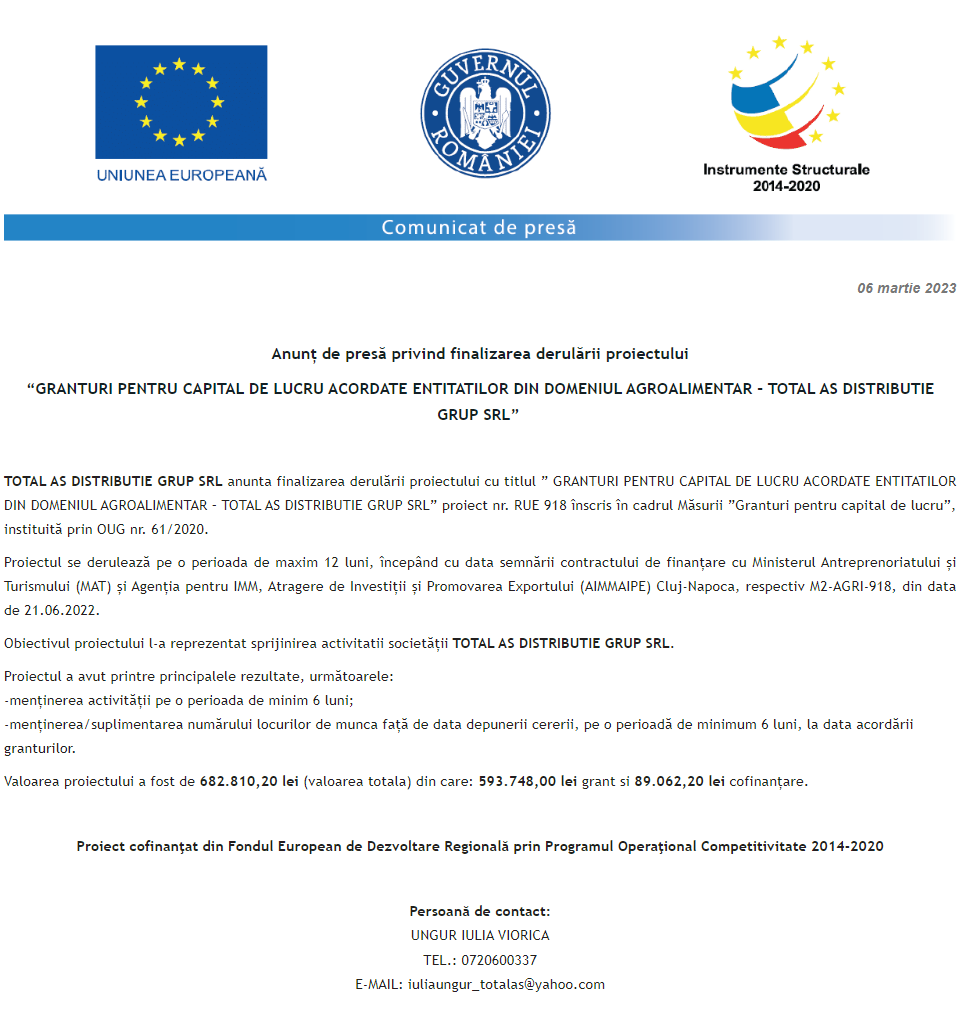 Comunicat de presă privind începerea derulării proiectului „Realizarea unei investitii initiale in domeniul constructiilor de catre MRK SPORTS BUSINESS S.R.L.” Anunț privind finalizarea derulării proiectului Grant pentru capital de lucru acordat beneficiarului UNITED EURO SPEDITION SRL Anunț privind finalizarea derulării proiectului Grant pentru capital de lucru acordat beneficiarului DSP EUROTRANS SRL Anunț privind finalizarea derulării proiectului Grant pentru capital de lucru acordat beneficiarului DDG CARGO SRL Anunț privind finalizarea derulării proiectului Grant pentru capital de lucru acordat beneficiarului EXPRESS EUROSCAN SRL Anunț privind finalizarea derulării proiectului Grant capital de lucru AGRI-FOOD acordat beneficiarului BIOPLANTSEM SRL Anunț privind finalizarea derulării proiectului Grant capital de lucru AGRI-FOOD acordat beneficiarului AGRITOP EST SRL Comunicat de presă privind începerea derulării proiectului „Dezvoltarea societatii SMVET SERV SRL prin retehnologizarea cu echipamente performante nepoluante” Anunț privind finalizarea derulării proiectului Grant capital de lucru AGRI-FOOD acordat beneficiarului TOTAL AS DISTRIBUTIE GRUP S.R.L. Pagina 144 din 216«Prima pagină‹Anterioară135136137138139140141142143144145146147148149150151152153‹Următoare »Ultima pagină Publică Anunţ