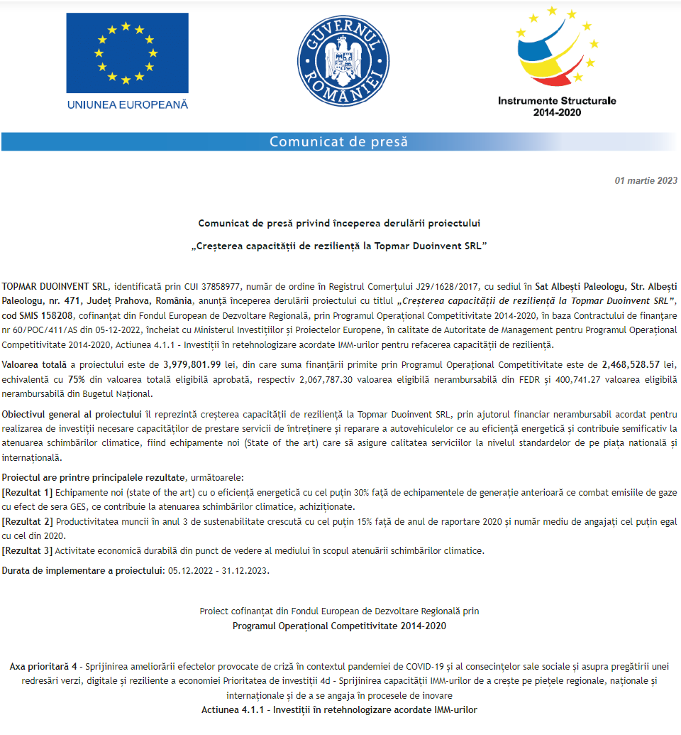 Comunicat de presă privind începerea derulării proiectului “Extinderea activitatii GNO Confectii” Comunicat de presă privind finalizarea proiectului „Capital de lucru pentru Aba BEE Licious SRL” în cadrul măsurii „Granturi pentru capital de lucru AGRI-FOOD” Comunicat de presă privind începerea derulării proiectului „Dezvoltarea societatii BAUROM INTENS SRL prin achizitia de echipamente performante si nepoluante” Anunț privind finalizarea derulării proiectului Grant capital de lucru AGRI-FOOD acordat beneficiarului MAXIMAL PRINT S.R.L. Anunț privind finalizarea derulării proiectului Grant capital de lucru AGRI-FOOD acordat beneficiarului S.C. GAZDI PROD S.R.L. Comunicat de presă privind începerea derulării proiectului „Creșterea capacității de reziliență la Topmar Duoinvent SRL”, cod Smis 158208 Comunicat de presă privind începerea derulării proiectului „Consolidarea poziției pe piața prin retehnologizarea societății OMT BUSINESS MANAGER SRL, în vederea refacerii capacității de reziliența” Comunicat de presă privind începerea derulării proiectului „Retehnologizarea societății TGM GROUP EXCLUSIVE SRL prin achiziția de echipamente performante” Comunicat de presă privind începerea derulării proiectului „Realizarea unei investitii initiale in domeniul constructiilor de catre ATLETIC UTILAJE SRL” Pagina 145 din 215«Prima pagină‹Anterioară136137138139140141142143144145146147148149150151152153154‹Următoare »Ultima pagină Publică Anunţ