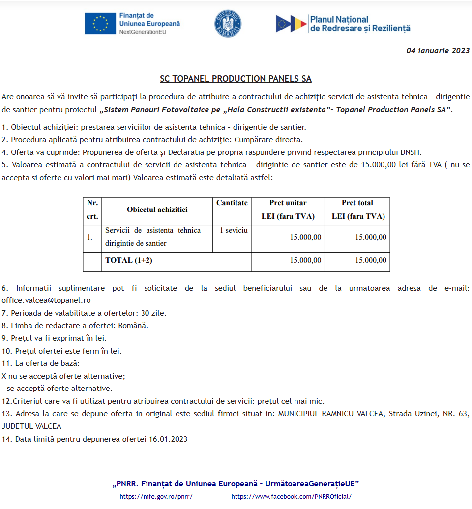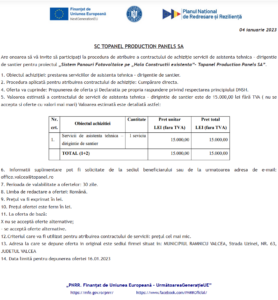 Anunț privind finalizarea derulării proiectului Grant capital de lucru AGRI-FOOD acordat beneficiarului SUPER IMPOSER S.R.L. Anunț privind începerea derulării proiectului Grant capital de lucru AGRI-FOOD acordat beneficiarului PROFI ELEMENTS S.R.L. Anunt procedura de achiziție servicii de asistenta tehnica – dirigentie de santier Anunț privind începerea derulării proiectului Grant capital de lucru AGRI-FOOD acordat beneficiarului ART DESSERT S.R.L. Anunț privind finalizarea derulării proiectului Grant capital de lucru AGRI-FOOD acordat beneficiarului NICOLTANA SA Anunț privind începerea derulării proiectului Grant capital de lucru AGRI-FOOD acordat beneficiarului OCEAN FISH S.R.L. Anunț privind începerea derulării proiectului Grant capital de lucru AGRI-FOOD acordat beneficiarului BEFEMESA S.R.L. Anunț privind începerea derulării proiectului Grant capital de lucru AGRI-FOOD acordat beneficiarului SAL-PAN S.R.L. Anunț privind începerea derulării proiectului Grant capital de lucru AGRI-FOOD acordat beneficiarului CRISTIN N L IMPEX S.R.L. Pagina 152 din 215«Prima pagină‹Anterioară143144145146147148149150151152153154155156157158159160161‹Următoare »Ultima pagină Publică Anunţ