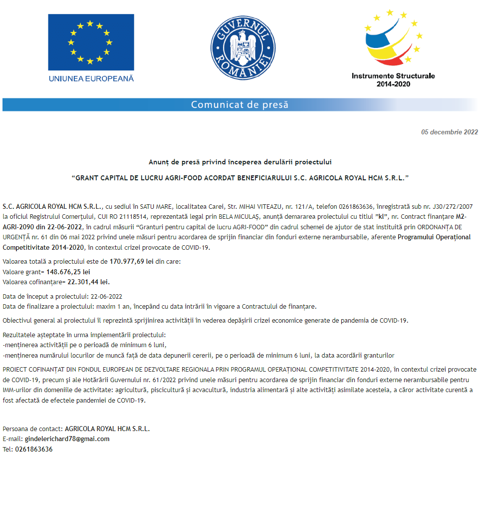 Anunț privind începerea derulării proiectului Grant capital de lucru AGRI-FOOD acordat beneficiarului EDY-AND CONSTRUCŢII S.R.L. Anunț privind finalizarea derulării proiectului Grant capital de lucru AGRI-FOOD acordat beneficiarului PACKSOM PRODIMPEX S.R.L. Anunț privind începerea derulării proiectului Grant capital de lucru AGRI-FOOD acordat beneficiarului GENERAL CONCEPT SOLUTIONS GEOEST S.R.L. Anunț privind începerea derulării proiectului Grant capital de lucru AGRI-FOOD acordat beneficiarului S.C. AGRICOLA ROYAL HCM S.R.L. Anunț privind finalizarea derulării proiectului Grant capital de lucru AGRI-FOOD acordat beneficiarului MĂR DE BRAN S.R.L. Anunț privind începerea derulării proiectului Grant capital de lucru AGRI-FOOD acordat beneficiarului AGROMOL HURJUIENI SRL Anunț privind începerea derulării proiectului Grant capital de lucru AGRI-FOOD acordat beneficiarului PATISENSE S.R.L. Anunț privind începerea derulării proiectului Grant capital de lucru AGRI-FOOD acordat beneficiarului PHIL PRODUCT S.R.L. Anunț privind începerea derulării proiectului Grant capital de lucru AGRI-FOOD acordat beneficiarului DONIFA S.R.L. Pagina 155 din 215«Prima pagină‹Anterioară146147148149150151152153154155156157158159160161162163164‹Următoare »Ultima pagină Publică Anunţ