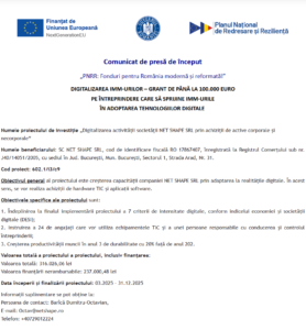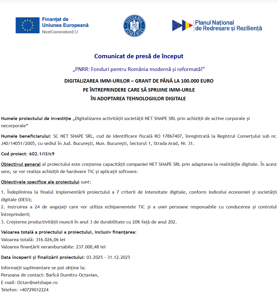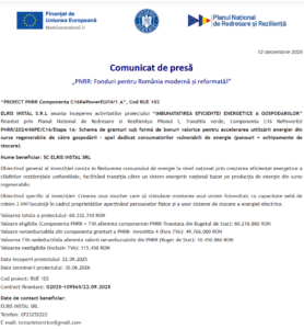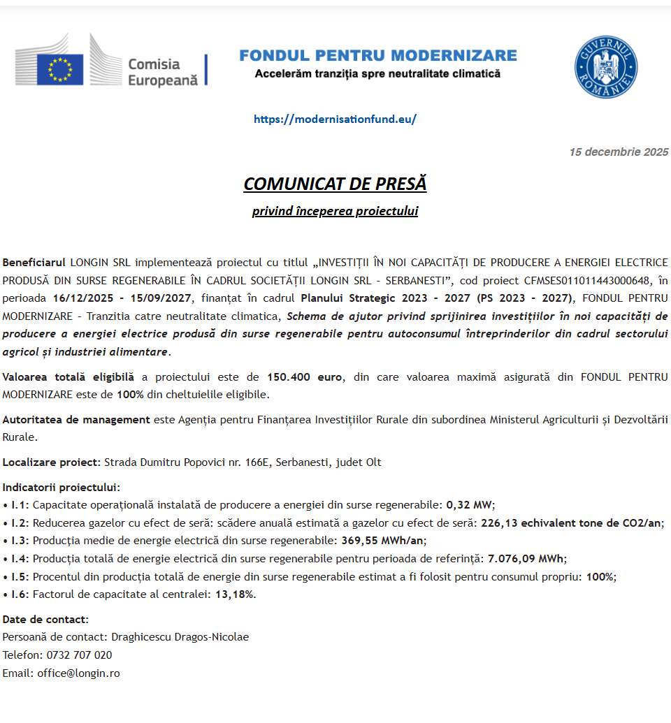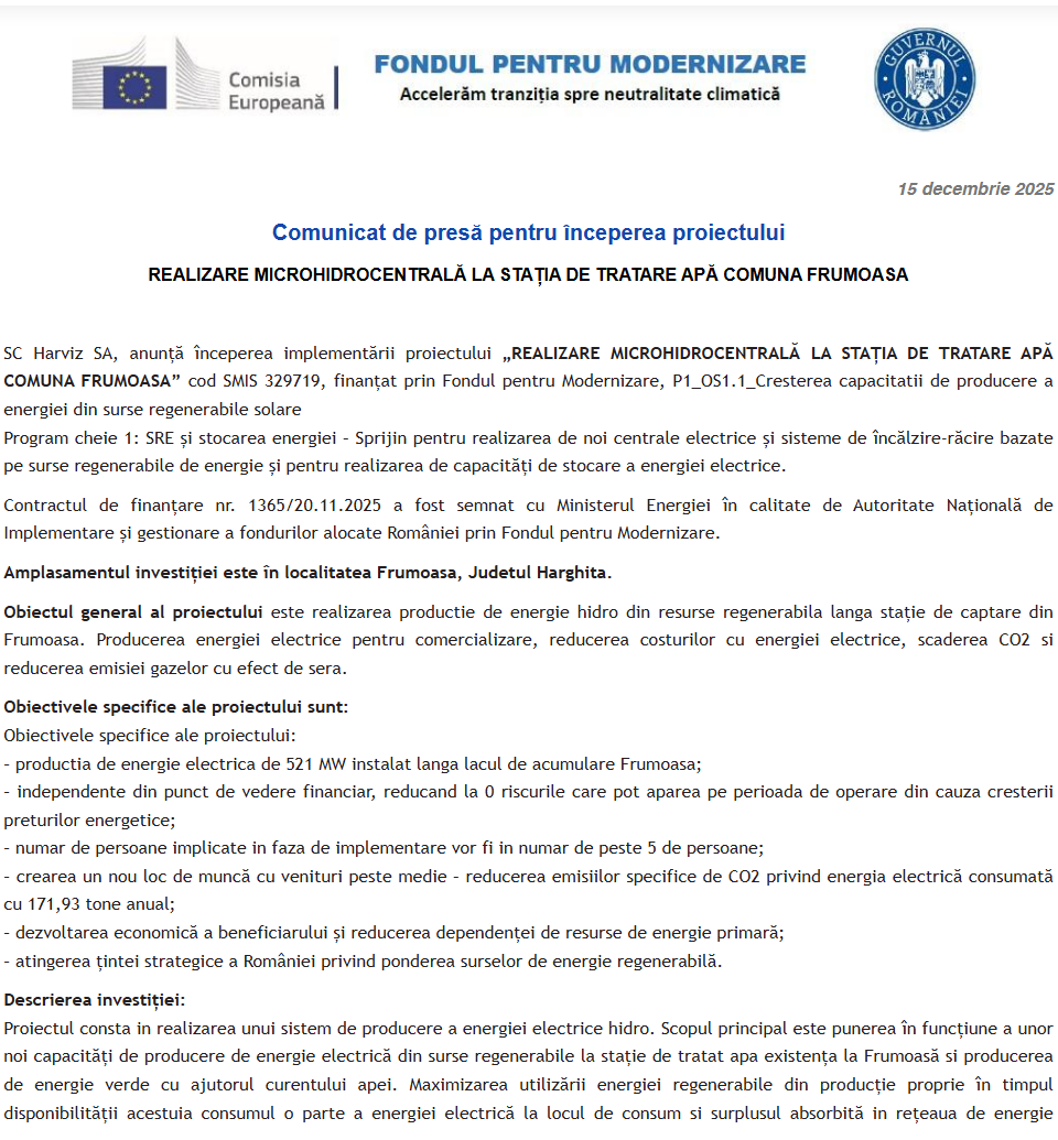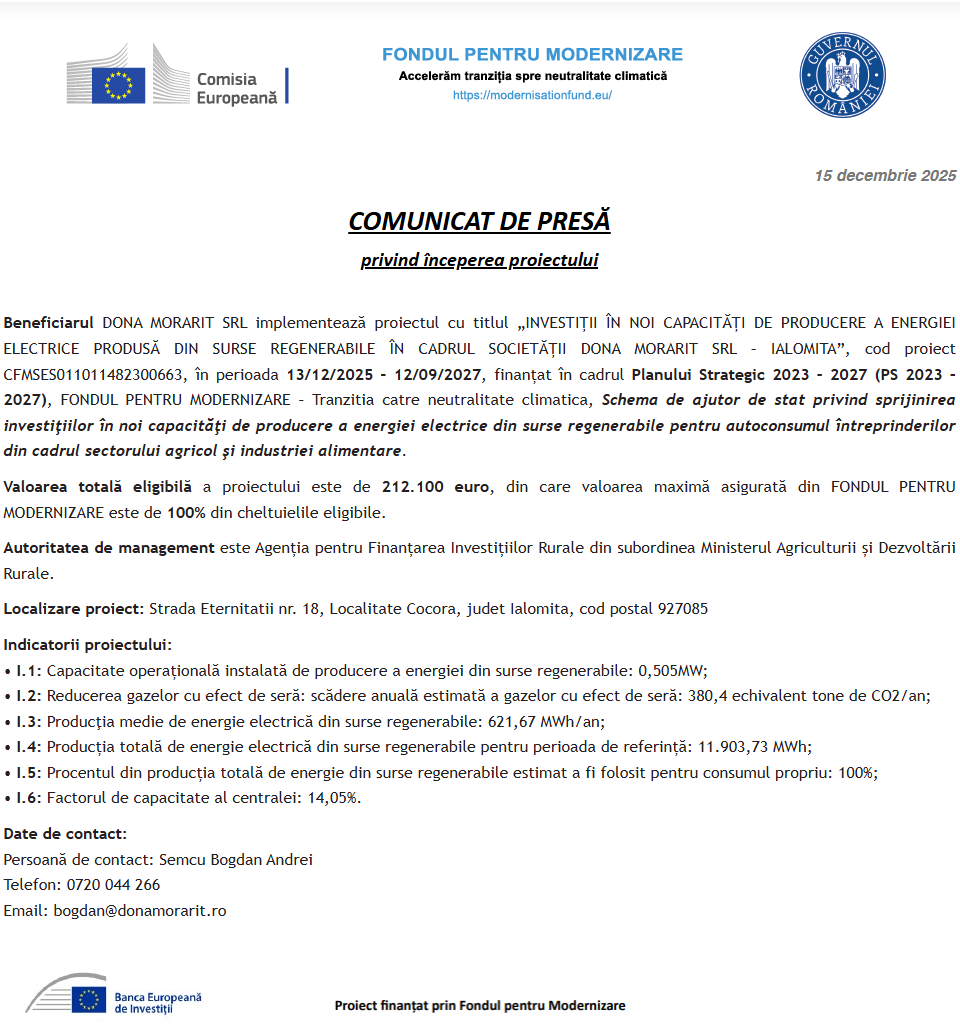 Comunicat de presă privind începerea derulării proiectului “Dezvoltarea digitala a societății PRODUCTIE SI PRESTARI “ALEXANDER” SRL” Comunicat de presă privind începerea derulării proiectului “Consolidarea poziției pe piață prin digitalizarea întreprinderii SC LUC CONCEPT SRL” Comunicat de presă privind începerea derulării proiectului “Dezvoltarea digitala a societății PRODUCTIE SI PRESTARI “ALEXANDER” SRL” Anunt lansare procedura achizitii pentru servicii de consiliere profesionala pentru proiectul STAR Comunicat de presă privind începerea derulării proiectului „INVESTIȚII ÎN NOI CAPACITĂȚI DE PRODUCERE A ENERGIEI ELECTRICE PRODUSĂ DIN SURSE REGENERABILE ÎN CADRUL SOCIETĂȚII DONA MORARIT SRL – IALOMITA” Comunicat de presă privind începerea derulării proiectului „Digitalizarea activității societății NET SHAPE SRL prin achiziții de active corporale și necorporale” Comunicat de presă privind începerea derulării proiectului „REALIZARE MICROHIDROCENTRALĂ LA STAȚIA DE TRATARE APĂ COMUNA FRUMOASA” Comunicat de presă privind începerea derulării proiectului „INVESTIȚII ÎN NOI CAPACITĂȚI DE PRODUCERE A ENERGIEI ELECTRICE PRODUSĂ DIN SURSE REGENERABILE ÎN CADRUL SOCIETĂȚII LONGIN SRL – SERBANESTI” Comunicat de presă privind inceperea derulării proiectului „IMBUNATATIREA EFICIENTEI ENERGETICE A GOSPODARIILOR” Pagina 17 din 215«Prima pagină‹Anterioară891011121314151617181920212223242526‹Următoare »Ultima pagină Publică Anunţ