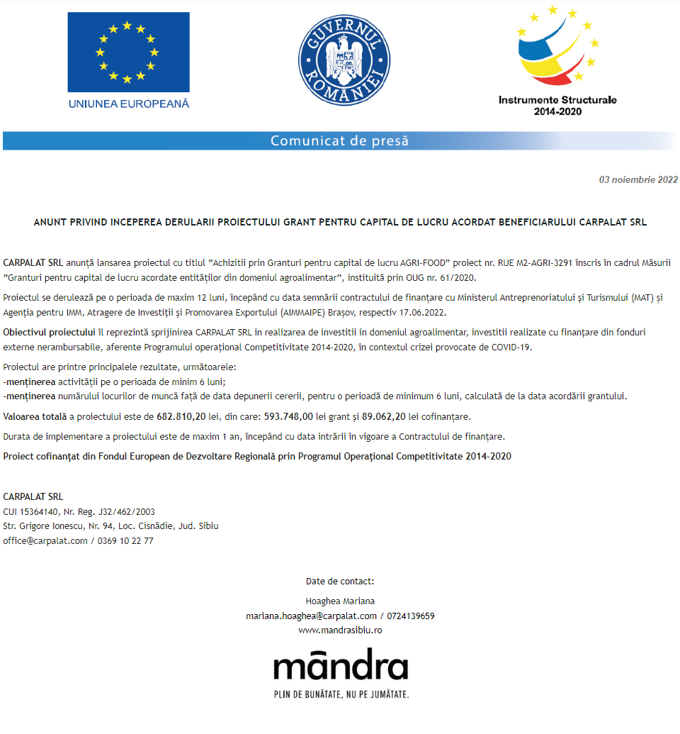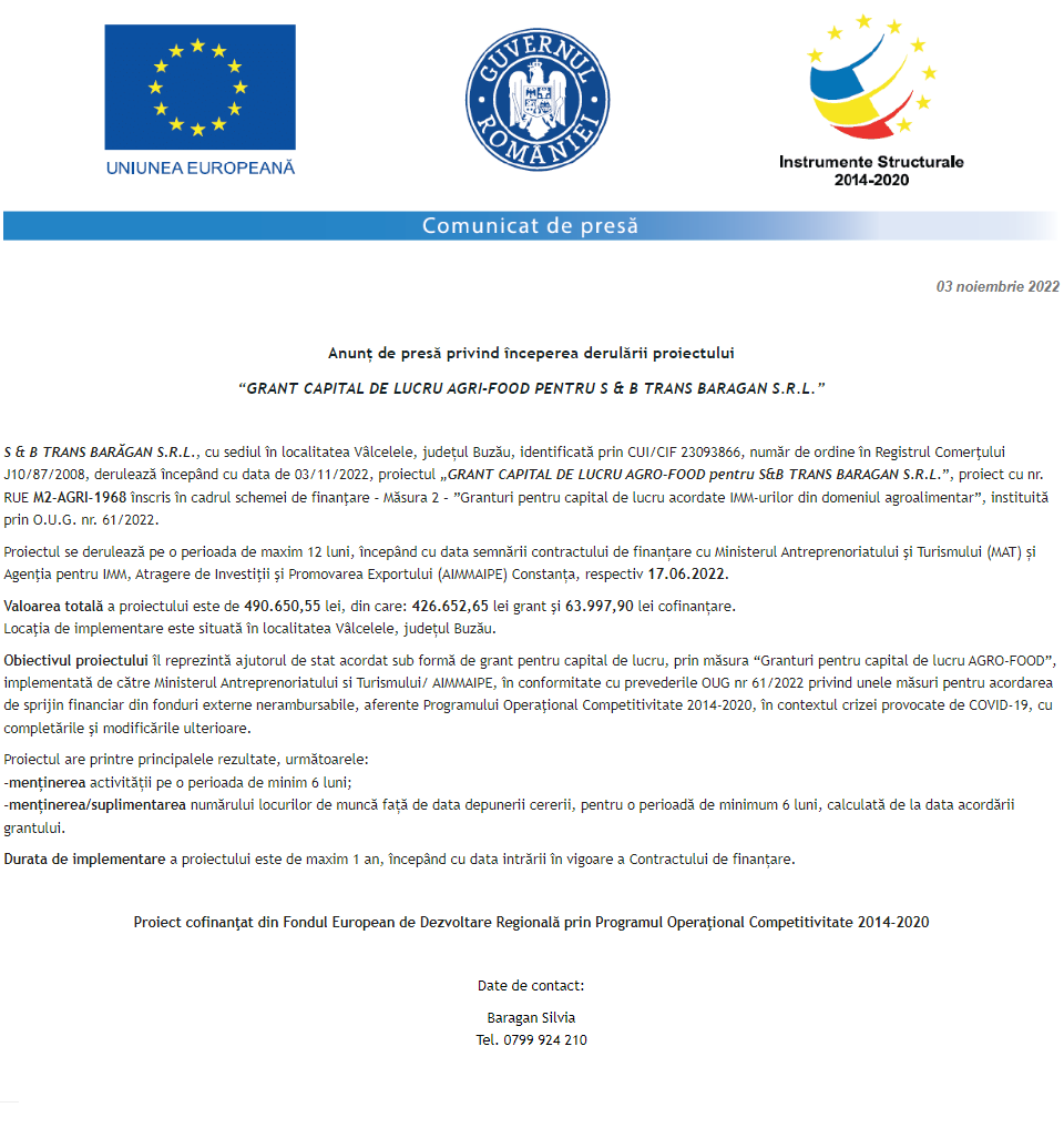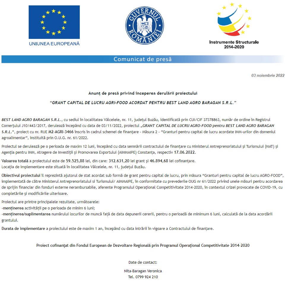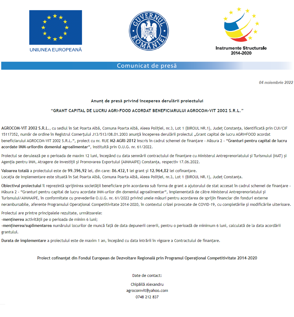 Anunț privind începerea derulării proiectului Grant capital de lucru AGRI-FOOD acordat beneficiarului AGROCOM-VIT 2002 S.R.L. Anunț privind începerea derulării proiectului Grant capital de lucru AGRI-FOOD acordat beneficiarului S.C. COMERT “M & CO” S.R.L. Anunț privind începerea derulării proiectului Grant capital de lucru AGRI-FOOD acordat beneficiarului BEST LAND AGRO BARAGAN S.R.L. Anunț privind începerea derulării proiectului Grant capital de lucru AGRI-FOOD acordat beneficiarului SC ROLOPAN SRL Anunț privind începerea derulării proiectului Grant capital de lucru AGRI-FOOD acordat beneficiarului S & B TRANS BARAGAN S.R.L. Anunț privind începerea derulării proiectului Grant capital de lucru AGRI-FOOD acordat beneficiarului SERENAS PROD S.R.L. Anunț privind începerea derulării proiectului Grant capital de lucru AGRI-FOOD acordat beneficiarului S.C. CARPALAT S.R.L. Anunț privind începerea derulării proiectului Grant capital de lucru AGRI-FOOD acordat beneficiarului MĂR DE BRAN S.R.L. Anunț privind începerea derulării proiectului Grant capital de lucru AGRI-FOOD acordat beneficiarului CAN-LEO S.R.L. Pagina 173 din 215«Prima pagină‹Anterioară164165166167168169170171172173174175176177178179180181182‹Următoare »Ultima pagină Publică Anunţ