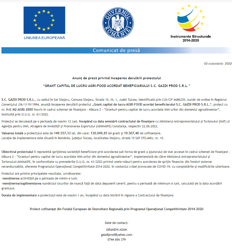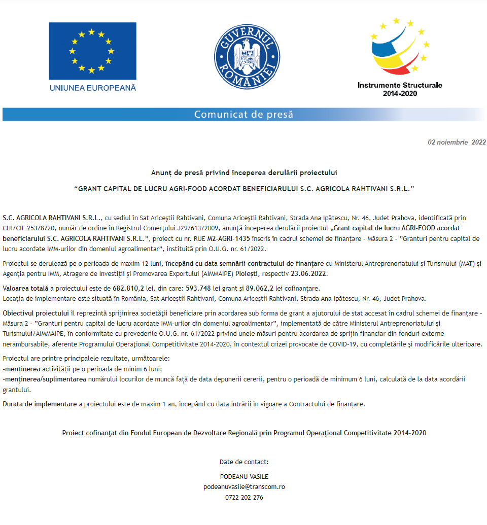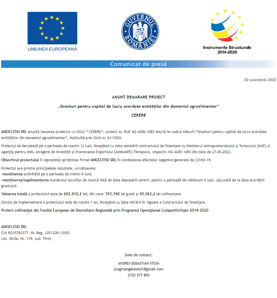 Anunț privind începerea derulării proiectului Grant capital de lucru AGRI-FOOD acordat beneficiarului S.C. AGRO-FLAVY S.R.L. Anunț privind începerea derulării proiectului Grant capital de lucru AGRI-FOOD acordat beneficiarului S.C. ANGELESSI S.R.L. Anunț privind începerea derulării proiectului Grant capital de lucru AGRI-FOOD acordat beneficiarului ECO AMD ACTIV S.R.L. Anunț privind începerea derulării proiectului Grant capital de lucru AGRI-FOOD acordat beneficiarului S.C. FRILEU PROD S.R.L. Anunț privind începerea derulării proiectului Grant capital de lucru AGRI-FOOD acordat beneficiarului S.C. AMALTHIA EXIM S.R.L. Anunț privind începerea derulării proiectului Grant capital de lucru AGRI-FOOD acordat beneficiarului S.C. AGRICOLA RAHTIVANI S.R.L. Anunț privind începerea derulării proiectului Grant capital de lucru AGRI-FOOD acordat beneficiarului S.C. GAZDI PROD S.R.L. Anunț privind începerea derulării proiectului Grant capital de lucru AGRI-FOOD acordat beneficiarului PANI-ENTERPRISE SRL S.R.L. Anunț privind începerea derulării proiectului Grant capital de lucru AGRI-FOOD acordat beneficiarului S.C. SIMA PROD S.R.L. Pagina 175 din 215«Prima pagină‹Anterioară166167168169170171172173174175176177178179180181182183184‹Următoare »Ultima pagină Publică Anunţ