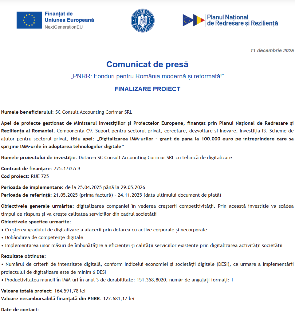 Anunt lansare procedura achizitii pentru servicii de consiliere profesionala pentru proiectul ARCE – Ascultă, Recomandă, Conectează-te, Exprimă Comunicat de presă privind începerea derulării proiectului „INVESTIȚII ÎN NOI CAPACITĂȚI DE PRODUCERE A ENERGIEI ELECTRICE PRODUSĂ DIN SURSE REGENERABILE ÎN CADRUL SOCIETĂȚII OVINE-SALAJ SRL – HERECLEAN” Comunicat de presă privind începerea derulării proiect dotare cabinet COREF MEDIS SRL Comunicat de presă privind finalizarea derulării proiectului „Digitalizarea societatii Lucas Weddings SRL” Comunicat de presă privind finalizarea derulării proiectului “Dotarea SC Consult Accounting Corimar SRL cu tehnică de digitalizare” Comunicat de presă privind finalizarii derulării proiectului „INVESTIȚII ÎN NOI CAPACITĂȚI DE PRODUCERE A ENERGIEI ELECTRICE PRODUSĂ DIN SURSE REGENERABILE ÎN CADRUL SOCIETĂȚII PAMBAC S.A. – ROSIORI” Categories :Comunicate Fonduri Europene Comunicat de presă privind începerea derulării proiectului „INVESTIȚII ÎN NOI CAPACITĂȚI DE PRODUCERE A ENERGIEI ELECTRICE PRODUSĂ DIN SURSE REGENERABILE ÎN CADRUL SOCIETĂȚII EUROPEAN PASTRY SRL” Comunicat de presă privind finalizarea derulării proiectului “Dotarea SC Consult Accounting Corimar SRL cu tehnică de digitalizare” Comunicat de presă privind finalizarea derulării proiectului „ÎMPĂDURIRE TERENURI AGRICOLE-CELARU 1” Pagina 18 din 215«Prima pagină‹Anterioară9101112131415161718192021222324252627‹Următoare »Ultima pagină Publică Anunţ