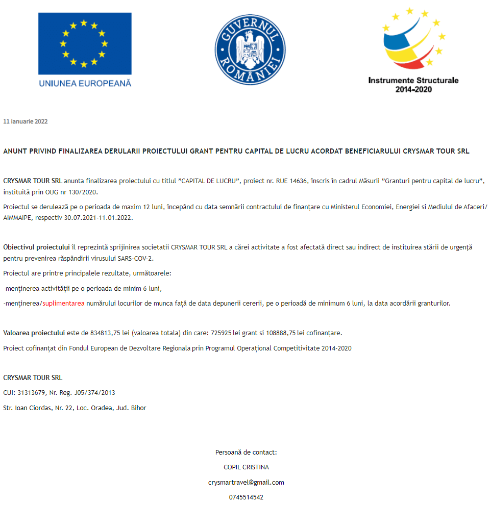 Anunț privind finalizarea derulării proiectului Grant pentru capital de lucru acordat beneficiarului CRYSMAR TOUR SRL Anunț privind finalizarea derulării proiectului Grant pentru capital de lucru acordat beneficiarului PROD COM CLAS SRL Anunț privind finalizarea derulării proiectului Grant pentru capital de lucru acordat beneficiarului PELLA-THEO SRL Anunț privind finalizarea derulării proiectului Grant pentru capital de lucru acordat beneficiarului MAMIAPREST SRL Anunț privind finalizarea derulării proiectului Grant pentru capital de lucru acordat beneficiarului VISUAL DESIGN STUDIO SRL Anunț privind începerea derulării proiectului Grant pentru capital de lucru acordat beneficiarului ORIGINAL TRADITION SRL Anunț privind finalizarea derulării proiectului Grant pentru capital de lucru acordat beneficiarului MINITEHNICUS SRL Anunț privind finalizarea derulării proiectului Grant pentru capital de lucru acordat beneficiarului EUCOM AGILE LEARNING SRL Anunț privind finalizarea derulării proiectului Grant pentru capital de lucru acordat beneficiarului BASAROM PRODCOM SRL Pagina 207 din 215«Prima pagină‹Anterioară198199200201202203204205206207208209210211212213214215‹Următoare Publică Anunţ