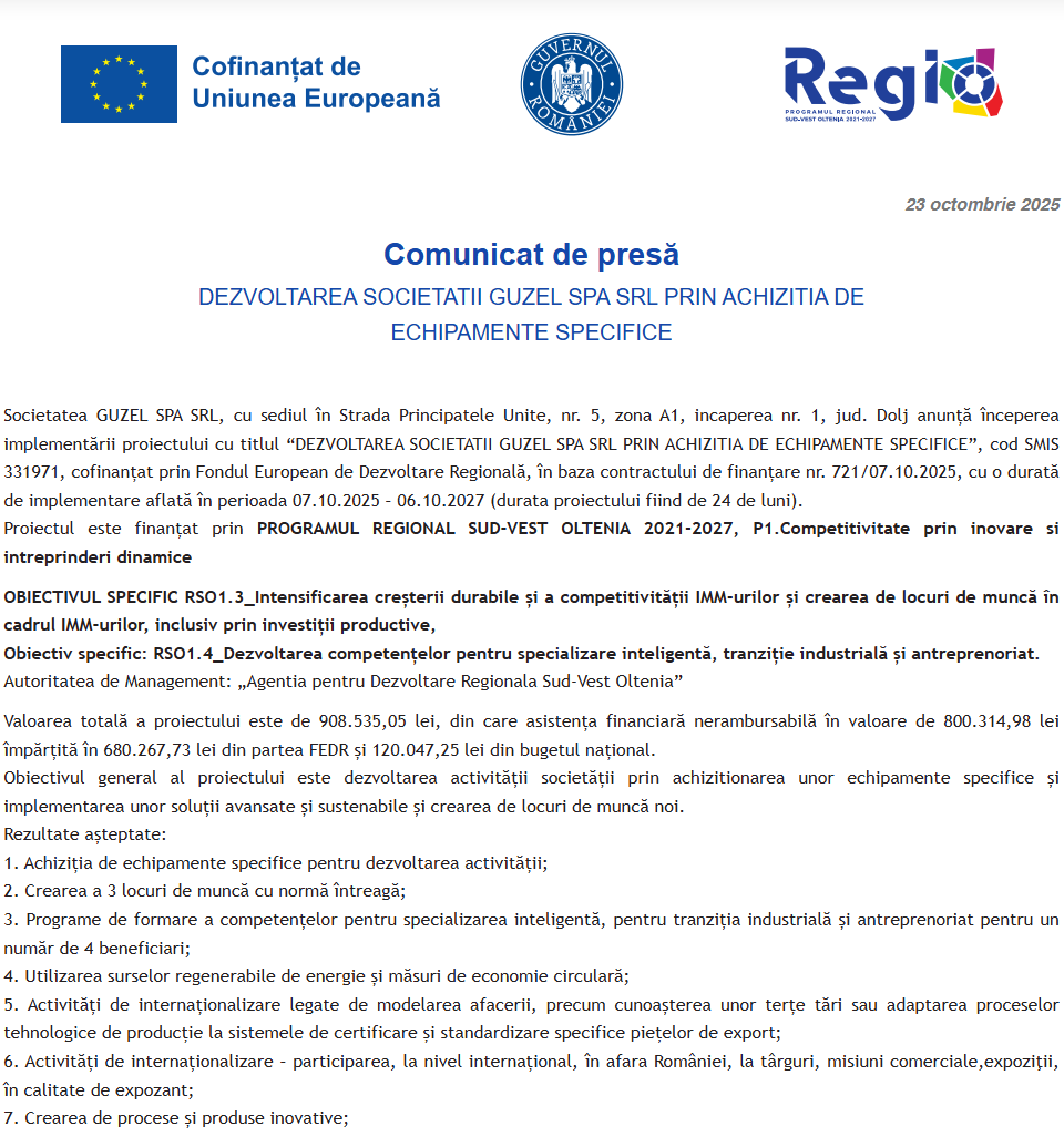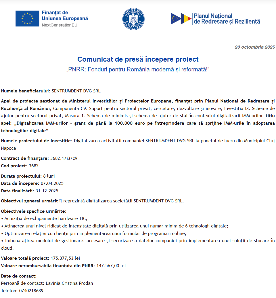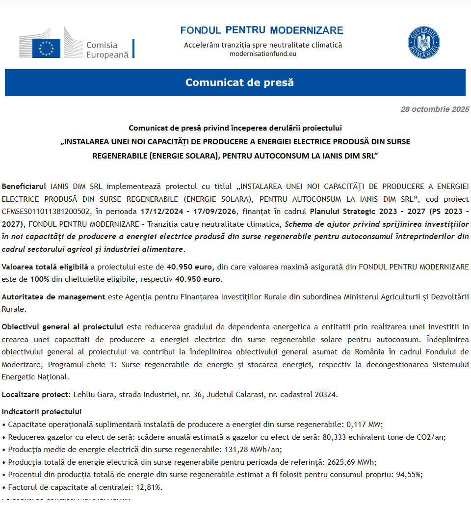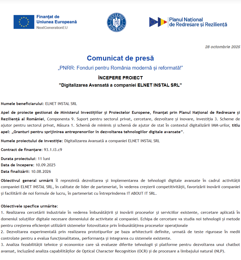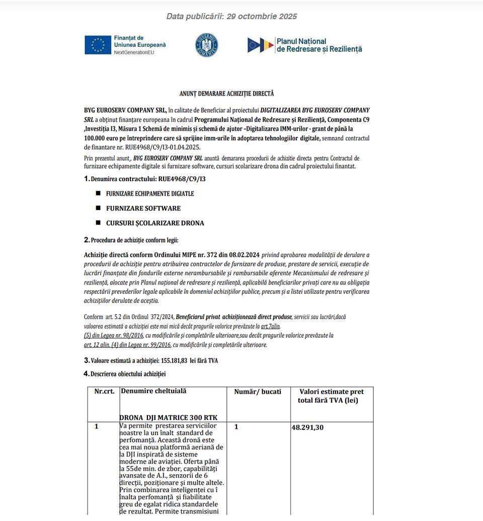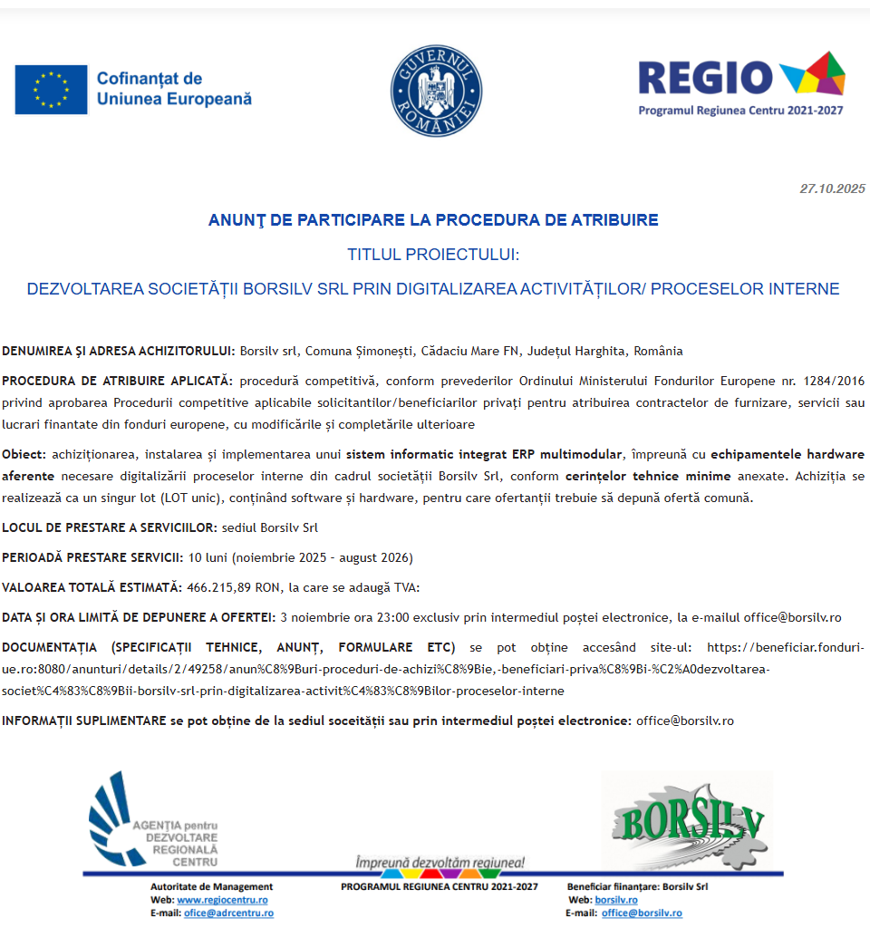 ANUNȚ DEMARARE ACHIZIȚIE DIRECTĂ – DIGITALIZAREA BYG EUROSERV COMPANY SRL Comunicat de presă privind începerea derulării proiectului “Digitalizarea Avansată a companiei ELNET INSTAL SRL” Comunicat de presă privind începerea derulării proiectului „INSTALAREA UNEI NOI CAPACITĂŢI DE PRODUCERE A ENERGIEI ELECTRICE PRODUSĂ DIN SURSE REGENERABILE (ENERGIE SOLARA), PENTRU AUTOCONSUM LA IANIS DIM SRL” Comunicat de presă privind începerea derulării proiectului „Creșterea competitivității firmei STATUTAR S.R.L prin achiziția de active” Comunicat de presă privind începerea derulării proiectului “Extinderea serviciilor SC IANISINTER COMPANY SRL prin achizitia de echipamente” Comunicat de presă privind începerea derulării proiectului „Creșterea competitivității firmei STATUTAR S.R.L prin achiziția de active” ANUNŢ DE PARTICIPARE LA PROCEDURA DE ATRIBUIRE sistem informatic integrat ERP multimodular Comunicat de presă privind începerea derulării proiectului “Digitalizarea activitatii companiei SENTRUMDENT DVG SRL la punctul de lucru din Municipiul Cluj Napoca” Comunicat de presă privind începerea derulării proiectului “DEZVOLTAREA SOCIETATII GUZEL SPA SRL PRIN ACHIZITIA DE ECHIPAMENTE SPECIFICE” Pagina 28 din 215«Prima pagină‹Anterioară19202122232425262728293031323334353637‹Următoare »Ultima pagină Publică Anunţ
