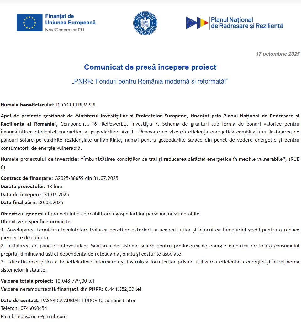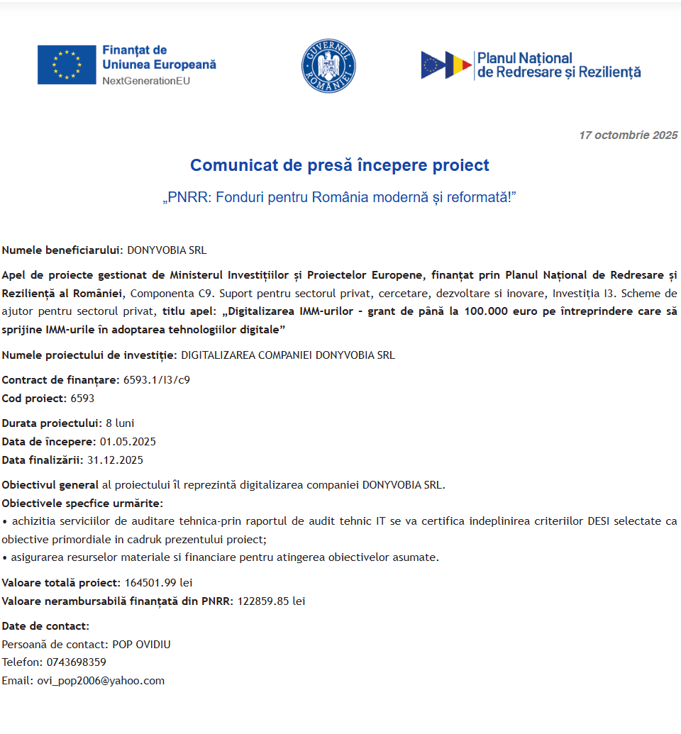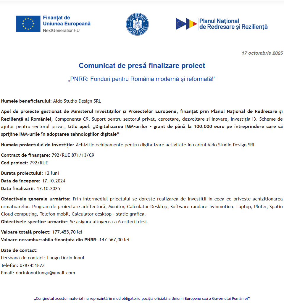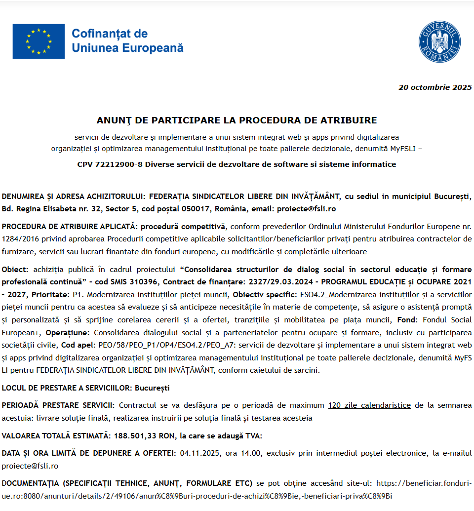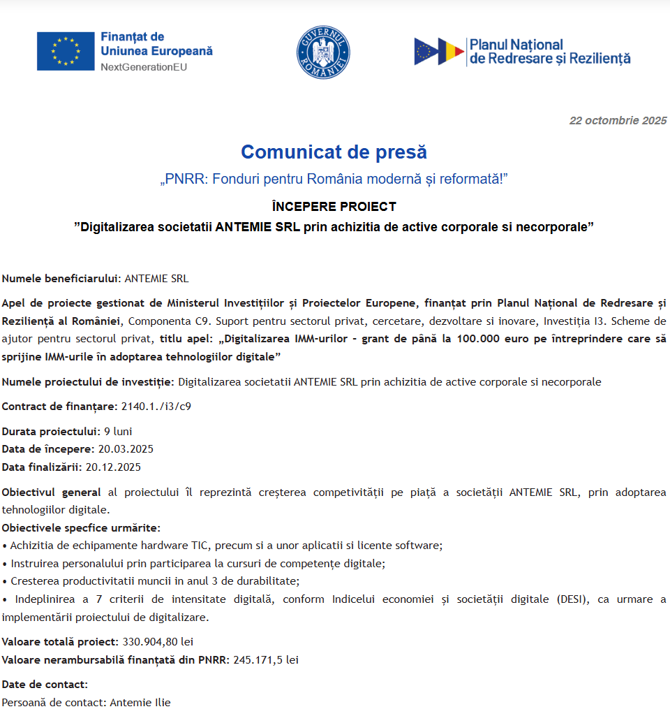 Comunicat de presă privind începerea derulării proiectului “Digitalizarea societatii ANTEMIE SRL prin achizitia de active corporale si necorporale” Comunicat de presă privind începerea derulării proiectului “DIGITALIZAREA SI OPTIMIZAREA PROCESELOR COMERCIALE IN CADRUL SC EAST POINT SRL” Categories :Comunicate Fonduri Europene ANUNŢ DE PARTICIPARE LA PROCEDURA DE ATRIBUIRE servicii de dezvoltare și implementare a unui sistem integrat web Comunicat de presă privind începerea derulării proiectului “Îmbunătățirea condițiilor de trai și reducerea sărăciei energetice în mediile vulnerabile” Comunicat de presă privind finalizarea derulării proiectului “Achizitie echipamente pentru digitalizare activitate in cadrul Aido Studio Design SRL” Comunicat de presă privind începerea derulării proiectului “DIGITALIZAREA COMPANIEI DONYVOBIA SRL” Comunicat de presă privind începerea derulării proiectului “DIGITALIZARE COMPANIEI RUCA TRADE SRL” Categories :Comunicate Fonduri Europene Anunt de participare la procedura competitiva având ca obiect: „ACHIZITIE ECHIPAMENTE” Comunicat de presă privind începerea derulării proiectului “DIVERSIFICAREA SERVICIILOR SC HEMANE REDNAILS SRL PRIN ACHIZITIA DE ECHIPAMENTE” Pagina 29 din 215«Prima pagină‹Anterioară20212223242526272829303132333435363738‹Următoare »Ultima pagină Publică Anunţ