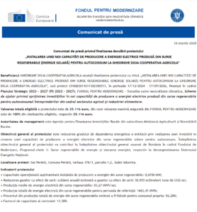 Comunicat de presă privind finalizarea derulării proiectului „Modernizarea și dezvoltarea pepinierelor forestiere existente și extinderea pepinierei din Lunca de Jos de către Ocolul Silvic Frumoasa SRL” Comunicat de presă privind finalizarea derulării proiectului „INSTALAREA UNEI NOI CAPACITĂŢI DE PRODUCERE A ENERGIEI ELECTRICE PRODUSĂ DIN SURSE REGENERABILE (ENERGIE SOLARĂ) PENTRU AUTOCONSUM LA GHEORGHE DOJA COOPERATIVA AGRICOLA” Comunicat de presă privind începerea derulării proiectului “DIGITALIZAREA COMPANIEI SIBIANU DRAGHILA SRL” Comunicat de presă privind finalizarea derulării proiectului “Eficientizarea activității companiei SC DRG DENTAL CARE SRL prin digitalizarea operațiunilor” Comunicat de presă privind începerea derulării proiectului „CONSTRUIREA UNEI CENTRALE ELECTRICE FOTOVOLTAICE (CEF) LA NIVELUL COMPANIEI SC FOODSCA SRL” Comunicat de presă privind începerea derulării proiectului “DIGITALIZARE TEHNICA DE AUTOMATIZARE – SIBIU SRL” Comunicat de presă privind începerea derulării proiectului “Digitalizarea activității PANEQUIP SRL” Comunicat de presă privind finalizarea derulării proiectului “MODERNIZAREA PRO SANA S.R.L. PRIN ACTIVITATI DE DIGITALIZARE” Comunicat de presă privind începerea derulării proiectului “Digitalizarea activitatii societatii GECOROM SA prin achizitia de active corporale si necorporale” Pagina 5 din 216‹Anterioară1234567891011121314‹Următoare »Ultima pagină Publică Anunţ