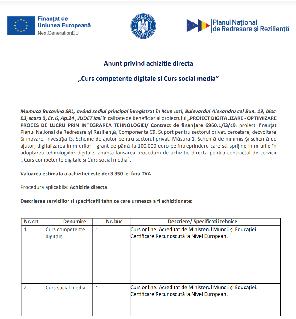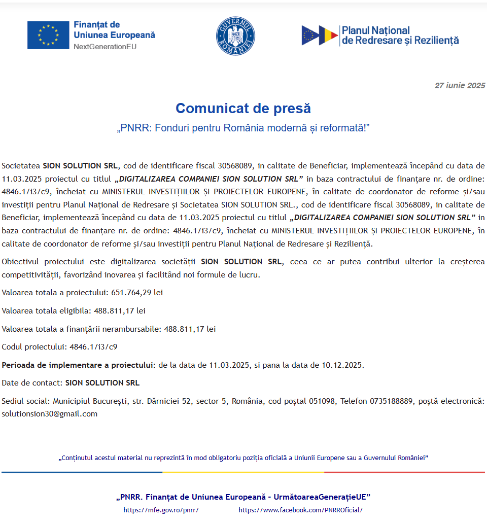 Anunt procedura achizitie servicii „Achiziția de Licență server, Licențe software, Microsoft 365, Licențe antivirus” Anunt procedura achizitie servicii „Curs competente digitale si Curs social media” Comunicat de presă privind începerea derulării proiectului “DIGITALIZAREA COMPANIEI SION SOLUTION SRL” Comunicat de presă privind începerea derulării proiectului „Construire pensiune turistica” Comunicat de presă privind începerea derulării proiectului “Demolare C2, modernizare și compartimentare clădire existentă C1, remodelare fațadă, extindere terasă parțial acoperită și retractabilă, schimbare destinație din spațiu administrativ în spațiu alimentație publică, împrejmuire teren” Comunicat de presă privind începerea derulării proiectului “Demolare C2, modernizare și compartimentare clădire existentă C1, remodelare fațadă, extindere terasă parțial acoperită și retractabilă, schimbare destinație din spațiu administrativ în spațiu alimentație publică, împrejmuire teren” Comunicat de presă privind începerea derulării proiectului “Demolare C2, modernizare și compartimentare clădire existentă C1, remodelare fațadă, extindere terasă parțial acoperită și retractabilă, schimbare destinație din spațiu administrativ în spațiu alimentație publică, împrejmuire teren” Comunicat de presă privind începerea derulării proiectului „INSTALAREA UNEI NOI CAPACITĂŢI DE PRODUCERE A ENERGIEI ELECTRICE PRODUSĂ DIN SURSE REGENERABILE (ENERGIE SOLARA), FARA STOCARE, PENTRU AUTOCONSUM LA EUROAVI SRL” Comunicat de presă privind începerea derulării proiectului “Imbunatatirea competitivitatii si a inovarii in cadrul societatii DND DUAL MEDIX SRL” Pagina 51 din 216«Prima pagină‹Anterioară42434445464748495051525354555657585960‹Următoare »Ultima pagină Publică Anunţ
