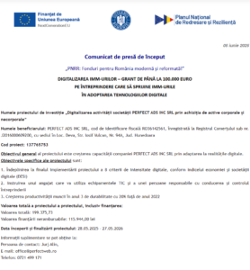 Comunicat de presă privind începerea derulării proiectului „Digitalizarea firmei Solixvent SRL” Comunicat de presă privind finalizarea derulării proiectului „,Achiziția de active pentru activitatea de producție a societății DORI COST SERVICE SRL”, cod MySMIS 313887 Comunicat de presă privind începerea derulării proiectului „EFICIENTIZAREA CONSUMULUI DE ENERGIE ELECTRICĂ LA UAT COMUNA SCHITU, JUD. GIURGIU PRIN INSTALARE DE PANOURI FOTOVOLTAICE CU PUTEREA DE 280 KWp” Comunicat de presă privind începerea derulării proiectului „EFICIENTIZAREA CONSUMULUI DE ENERGIE ELECTRICĂ LA UAT COMUNA FLORICA, JUD. BUZĂU PRIN INSTALARE DE PANOURI FOTOVOLTAICE CU PUTEREA DE 130 KW” Comunicat de presă privind începerea derulării proiectului “Cresterea productivitatii muncii societatii Vulpoi & Toader Management SRL prin optimizarea Digitalizarii societatii” Comunicat de presă privind începerea derulării proiectului “Digitalizarea activității societății NERTRANS CARGO SRL” Comunicat de presă privind începerea derulării proiectului “Digitalizare si Inovare TIC pentru S.C. NETVERS S.R.L” Comunicat de presă privind începerea derulării proiectului „Digitalizarea activității societății PERFECT ADS INC SRL prin achiziția de active corporale și necorporale” Comunicat de presă privind începerea derulării proiectului „EXTINDERE REȚELE DE ALIMENTARE CU APĂ ȘI CANALIZARE MENAJERĂ ÎN COM. BĂTARCI, JUD. SATU MARE” Pagina 58 din 216«Prima pagină‹Anterioară49505152535455565758596061626364656667‹Următoare »Ultima pagină Publică Anunţ
