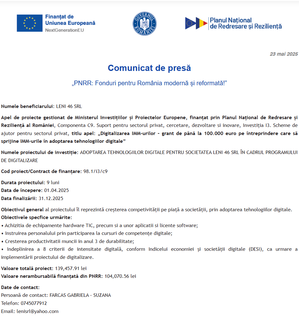 Comunicat de presă privind începerea derulării proiectului “DIGITALIZAREA AURA NET SRL” Comunicat de presă privind începerea derulării proiectului “DIGITALIZAREA ALL CARGO EXPRES SRL PRIN ACHIZIȚIA DE ECHIPAMENTE SPECIFICE ÎN ADOPTAREA TEHNOLOGIILOR DIGITALE” Comunicat de presă privind începerea derulării proiectului „Înființarea unei noi unități de testări și analize tehnice” Comunicat de presă privind începerea derulării proiectului “CONSOLIDAREA POZITIEI PE PIATA A COMPANIEI DEL CORSO FAMILY PRIN DIGITALIZAREA FLUXURILOR OPERATIONALE” Comunicat de presă privind începerea derulării proiectului “Dotarea SC Consult Accounting Corimar SRL cu tehnică de digitalizare” Comunicat de presă privind începerea derulării proiectului “DIGITALIZARE SUBLIME EVENTS SRL” Anunt lansare procedura achizitii pentru servicii de consiliere profesionala pentru proiectul PITA – Program de Învățare și Training Avansat Comunicat de presă privind începerea derulării proiectului „INSTALAREA UNEI NOI CAPACITĂŢI DE PRODUCERE A ENERGIEI ELECTRICE PRODUSĂ DIN SURSE REGENERABILE (ENERGIE SOLARĂ) PENTRU AUTOCONSUM LA CROWN CHAMP SRL” Comunicat de presă privind începerea derulării proiectului “ADOPTAREA TEHNOLOGIILOR DIGITALE PENTRU SOCIETATEA LENI 46 SRL ÎN CADRUL PROGRAMULUI DE DIGITALIZARE” Pagina 61 din 216«Prima pagină‹Anterioară52535455565758596061626364656667686970‹Următoare »Ultima pagină Publică Anunţ