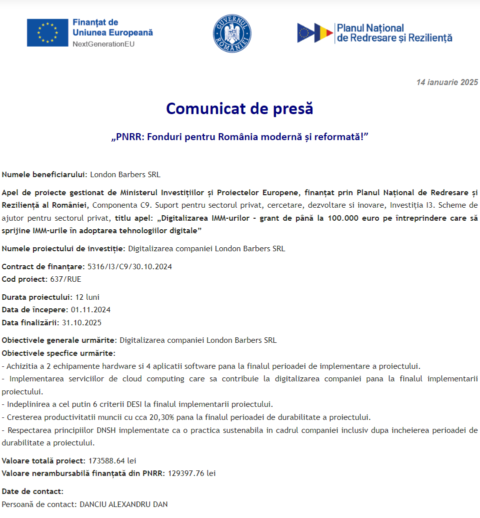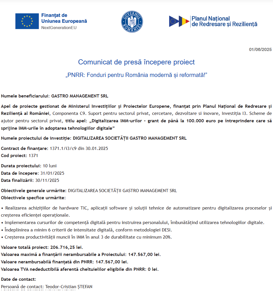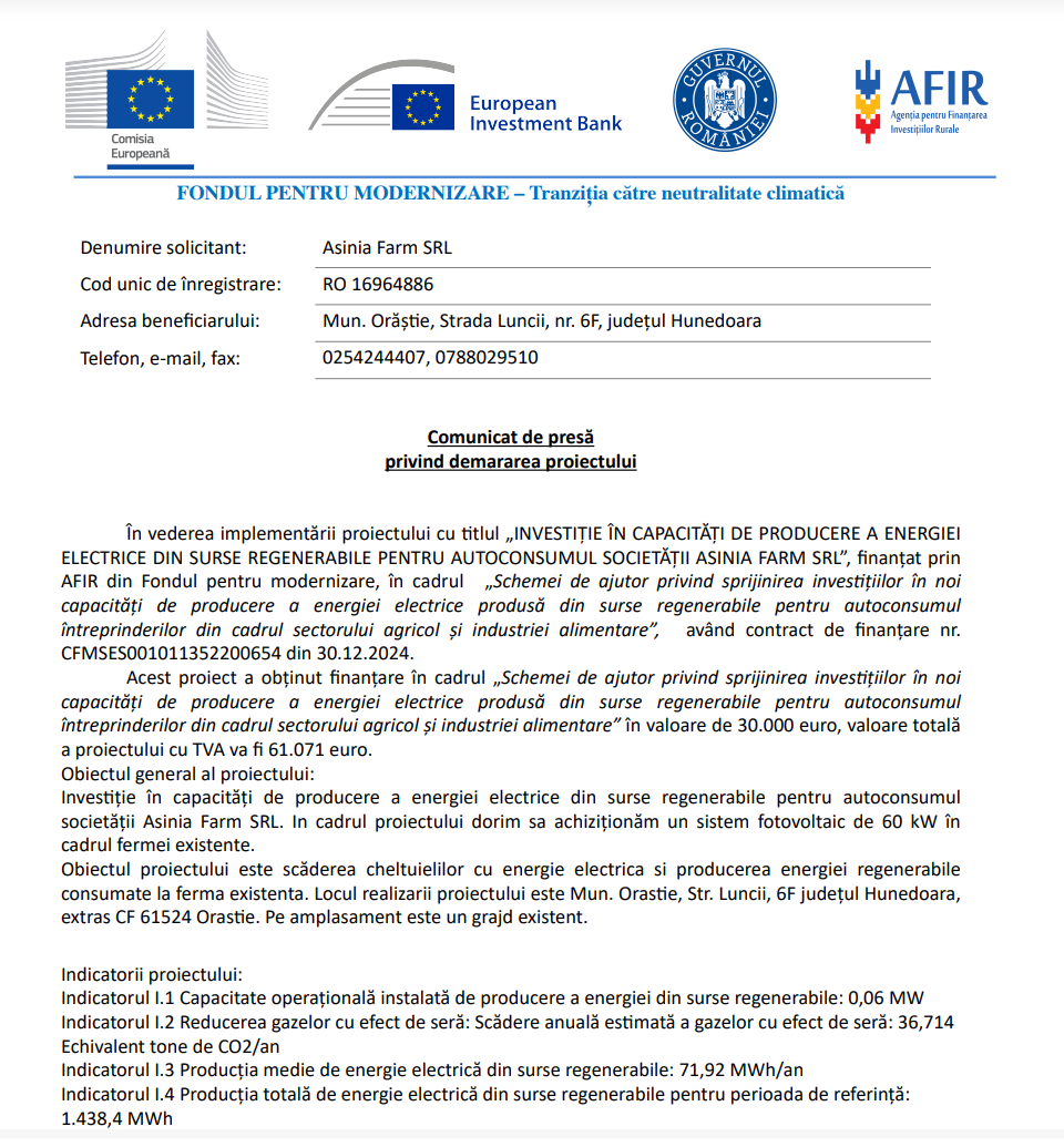 Comunicat de presă privind începerea derulării proiectului „DEZVOLTAREA AGRICULTURII PRIN PRACTICI DE IRIGARE EFICIENTE LA OUAI IVESTI PLOT 47- SPP48” Comunicat de presă privind începerea derulării proiectului „ÎNFIINȚARE PARC FOTOVOLTAIC ÎN VEDEREA PRODUCERII ENERGIEI ELECTRICE DIN SURSE REGENERABILE DE TIP SOLAR, PENTRU AUTOCONSUM – COMUNA GĂLBINAȘI, JUD. BUZĂU” Comunicat de presă privind începerea derulării proiectului „Digitalizarea companiei London Barbers SRL” Comunicat de presă privind începerea derulării proiectului „INVESTIȚIE ÎN CAPACITĂȚI DE PRODUCERE A ENERGIE ELECTRICE DIN SURSE REGENERABILE PENTRU AUTOCONSUMUL SOCIETĂȚII ASINIA FARM SRL” Comunicat de presă privind începerea derulării proiectului „Digitalizarea companiei SORIN IONITA PHOTOGRAPHY SRL prin achiziția de active corporale și necorporale” Comunicat de presă privind începerea derulării proiectului „FutureEd – Model educational inovativ” Anunț privind începerea derulării proiectului Grant capital de lucru AGRI-FOOD acordat beneficiarului VIO AGROSERV SRL Comunicat de presă privind începerea derulării proiectului “DIGITALIZAREA SOCIETĂȚII GASTRO MANAGEMENT SRL” Comunicat de presă privind începerea derulării proiectului „INFIINTARE CAPACITATE DE PRODUCTIE ELECTRICA OUAI DOAGA” Pagina 80 din 215«Prima pagină‹Anterioară71727374757677787980818283848586878889‹Următoare »Ultima pagină Publică Anunţ