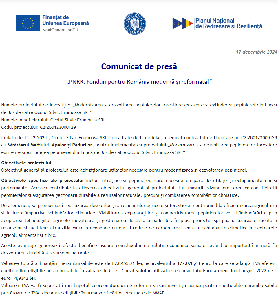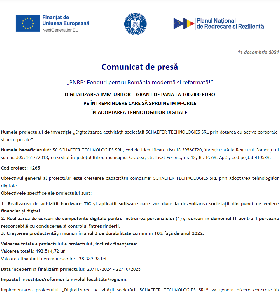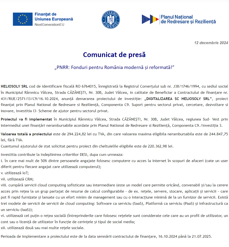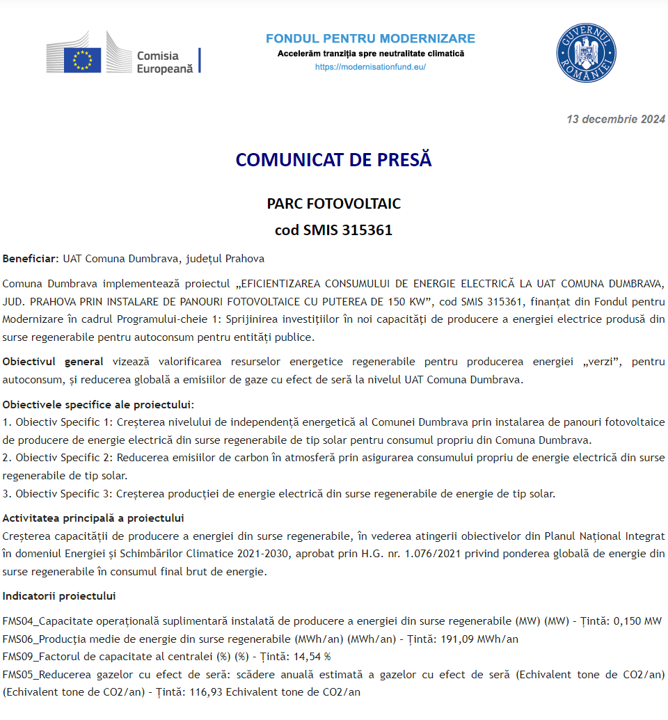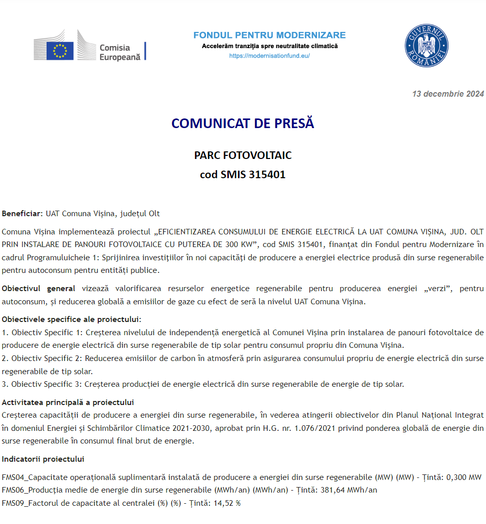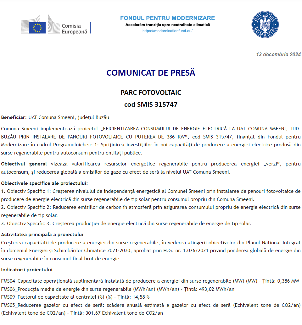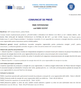Comunicat de presă privind începerea derulării proiectului „Modernizarea și dezvoltarea pepinierelor forestiere existente și extinderea pepinierei din Lunca de Jos de către Ocolul Silvic Frumoasa SRL” Comunicat de presă privind începerea derulării proiectului „EFICIENTIZAREA CONSUMULUI DE ENERGIE ELECTRICĂ LA UAT COMUNA DUMBRAVA, JUD. PRAHOVA PRIN INSTALARE DE PANOURI FOTOVOLTAICE CU PUTEREA DE 150 KW” Comunicat de presă privind începerea derulării proiectului „EFICIENTIZAREA CONSUMULUI DE ENERGIE ELECTRICĂ LA UAT COMUNA SMEENI, JUD. BUZĂU PRIN INSTALARE DE PANOURI FOTOVOLTAICE CU PUTEREA DE 386 KW” Comunicat de presă privind începerea derulării proiectului „EFICIENTIZAREA CONSUMULUI DE ENERGIE ELECTRICĂ LA UAT COMUNA VIȘINA, JUD. OLT PRIN INSTALARE DE PANOURI FOTOVOLTAICE CU PUTEREA DE 300 KW” Comunicat de presă privind începerea derulării proiectului „,Investiții pentru digitalizarea Profi Simcont SRL”, cod MySMIS 318729 Comunicat de presă privind începerea derulării proiectului „Crearea unei noi unități de testare și analize tehnice” Comunicat de presă privind începerea derulării proiectului „Cresterea gradului de digitalizare pentru prestarea de servicii medicale de către DARIUS MEDICAL CENTER SRL” Comunicat de presă privind începerea derulării proiectului „DIGITALIZAREA SC HELIOSOLY SRL” Comunicat de presă privind începerea derulării proiectului „Digitalizarea activității societății SCHAEFER TECHNOLOGIES SRL prin dotarea cu active corporale și necorporale” Pagina 82 din 215«Prima pagină‹Anterioară73747576777879808182838485868788899091‹Următoare »Ultima pagină Publică Anunţ
