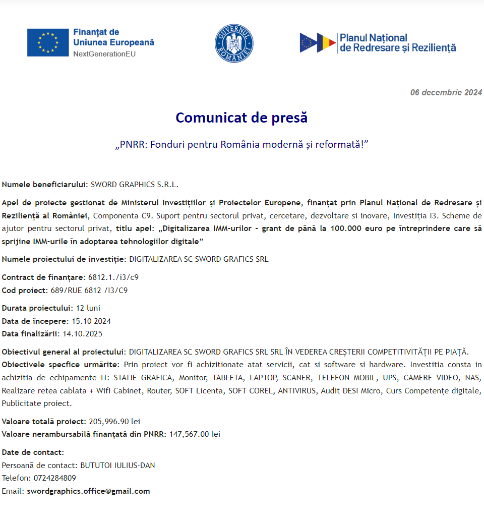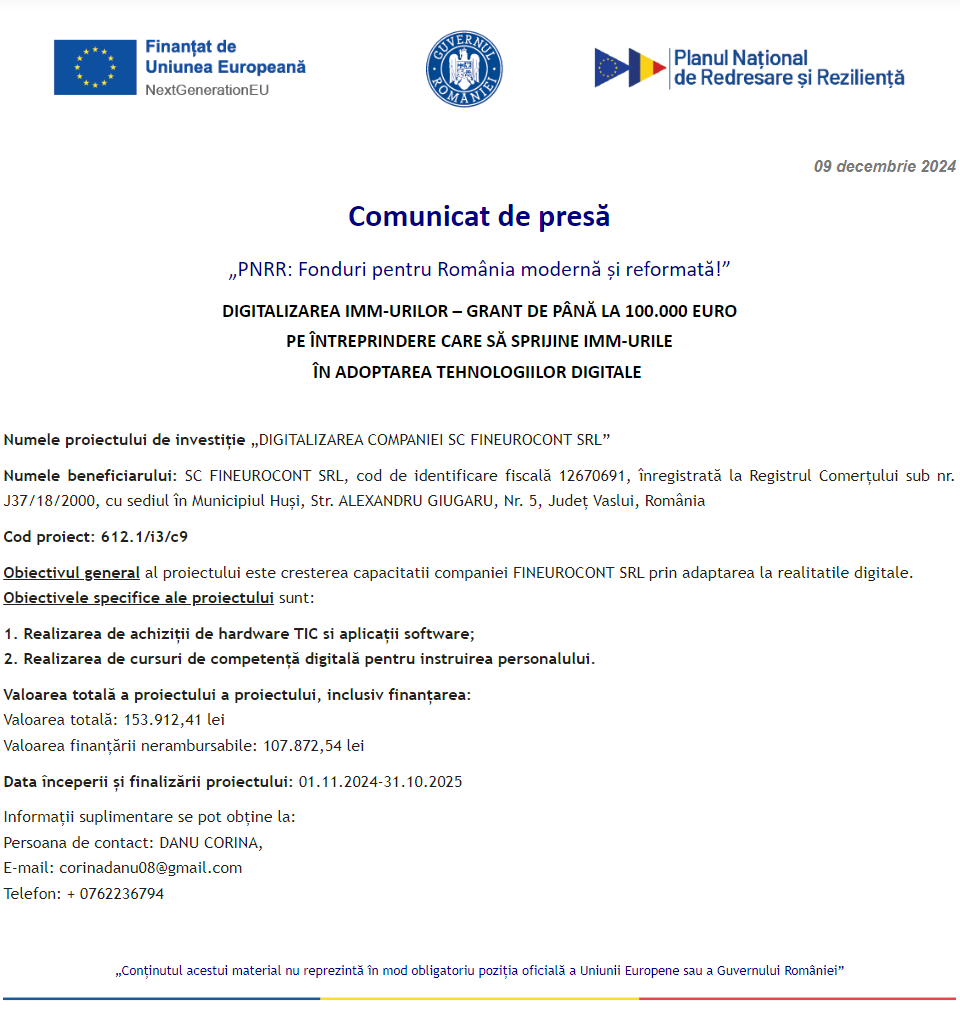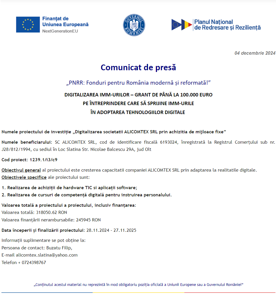 Comunicat de presă privind începerea derulării proiectului „DIGITALIZAREA INTREPRINDERII TONERMAG ONLINE SRL” Comunicat de presă privind începerea derulării proiectului „Îmbunătățirea performanței SC WESTFOURTH ARCHITECTURE SRL prin digitalizarea activității” Comunicat de presă privind începerea derulării proiectului „Digitalizarea societatii LE BLANC BALLROOM S.R.L.” Comunicat de presă privind începerea derulării proiectului „DIGITALIZAREA COMPANIEI SC FINEUROCONT SRL” Comunicat de presă privind începerea derulării proiectului „DIGITALIZAREA SC S.I.S. EVENTS SRL” Comunicat de presă privind finalizarea derulării proiectului „DOTAREA CU MOBILIER, MATERIALE DIDACTICE ȘI ECHIPAMENTE DIGITALE A UNITAȚII DE INVATAMANT PREUNIVERSITAR ȘCOALA GIMNAZIALA BRANIȘTEA” Comunicat de presă privind începerea derulării proiectului „DIGITALIZAREA SC SWORD GRAFICS SRL” Comunicat de presă privind începerea derulării proiectului „DIGITALIZAREA ACTIVITATII SC TOPOCAD EXPERTIZA TIMISOARA SRL” Comunicat de presă privind începerea derulării proiectului „Digitalizarea societatii ALICOMTEX SRL prin achizitia de mijloace fixe” Pagina 83 din 215«Prima pagină‹Anterioară74757677787980818283848586878889909192‹Următoare »Ultima pagină Publică Anunţ
