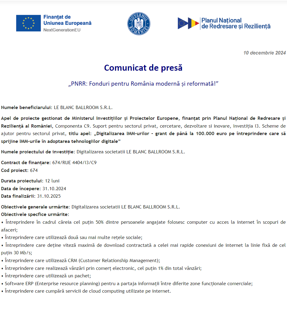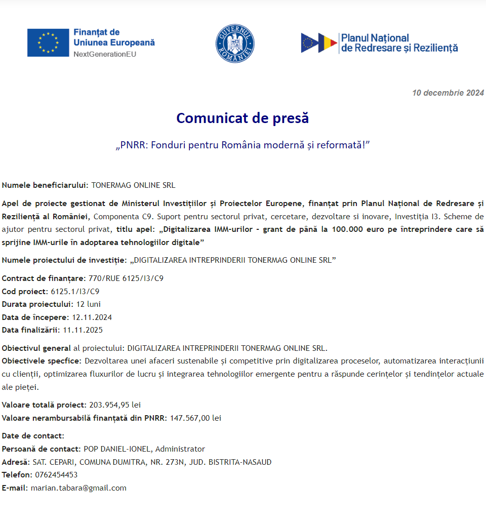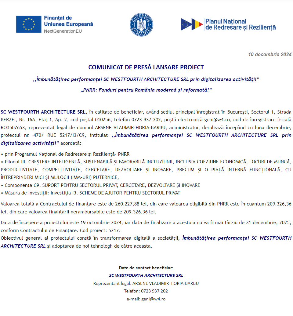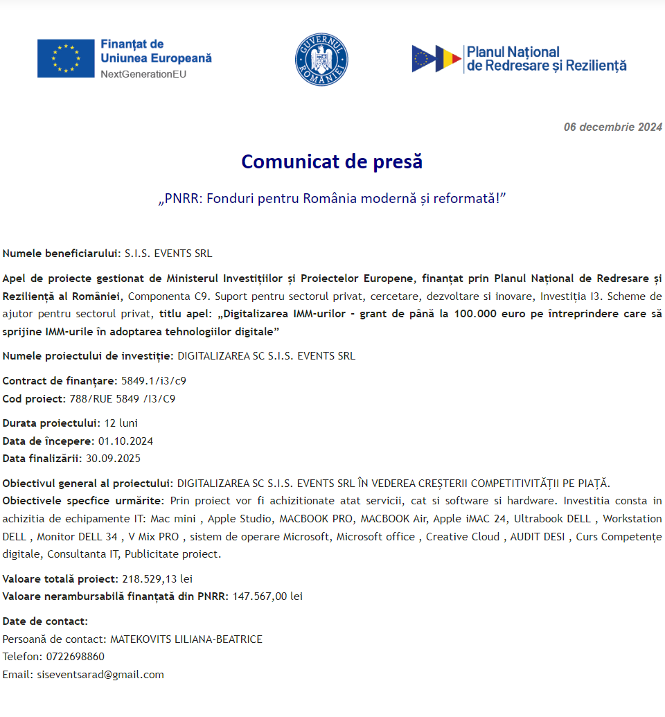 Comunicat de presă privind începerea derulării proiectului „DIGITALIZAREA INTREPRINDERII TONERMAG ONLINE SRL” Comunicat de presă privind începerea derulării proiectului „Îmbunătățirea performanței SC WESTFOURTH ARCHITECTURE SRL prin digitalizarea activității” Comunicat de presă privind începerea derulării proiectului „Digitalizarea societatii LE BLANC BALLROOM S.R.L.” Comunicat de presă privind începerea derulării proiectului „DIGITALIZAREA COMPANIEI SC FINEUROCONT SRL” Comunicat de presă privind începerea derulării proiectului „DIGITALIZAREA SC S.I.S. EVENTS SRL” Comunicat de presă privind finalizarea derulării proiectului „DOTAREA CU MOBILIER, MATERIALE DIDACTICE ȘI ECHIPAMENTE DIGITALE A UNITAȚII DE INVATAMANT PREUNIVERSITAR ȘCOALA GIMNAZIALA BRANIȘTEA” Comunicat de presă privind începerea derulării proiectului „DIGITALIZAREA SC SWORD GRAFICS SRL” Comunicat de presă privind începerea derulării proiectului „DIGITALIZAREA ACTIVITATII SC TOPOCAD EXPERTIZA TIMISOARA SRL” Comunicat de presă privind începerea derulării proiectului „Digitalizarea societatii ALICOMTEX SRL prin achizitia de mijloace fixe” Pagina 83 din 215«Prima pagină‹Anterioară74757677787980818283848586878889909192‹Următoare »Ultima pagină Publică Anunţ