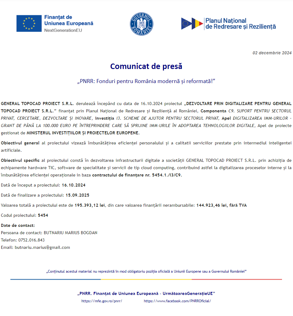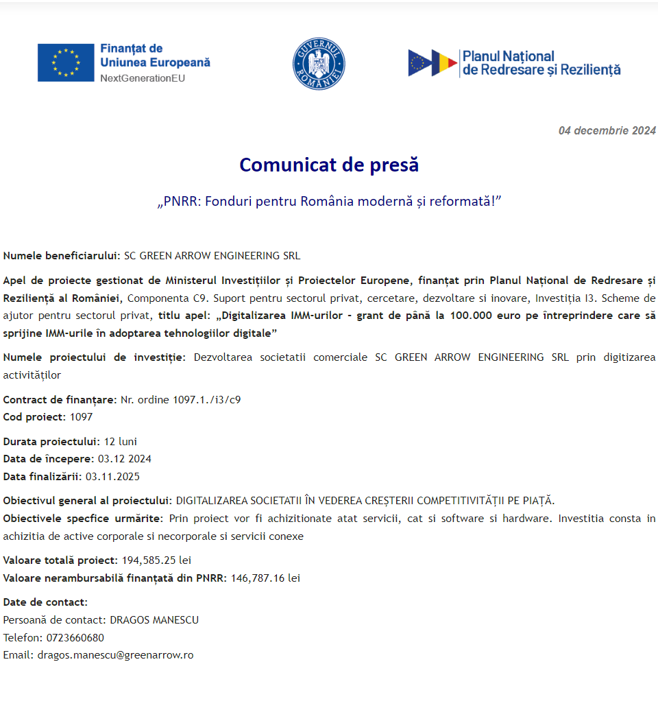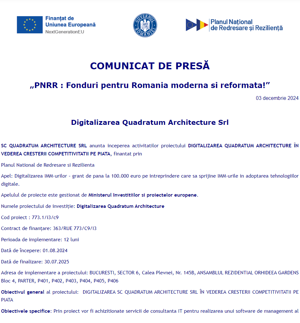 Comunicat de presă privind finalizarea derulării proiectului „Dotarea cu mobilier, materiale didactice și echipamente digitale a unităților de învățământ preuniversitar și a unităților conexe în UAT Comuna Foeni” Comunicat de presă privind începerea derulării proiectului „Dezvoltarea societatii comerciale SC GREEN ARROW ENGINEERING SRL prin digitizarea activităților” Comunicat de presă privind începerea derulării proiectului „DIGITALIZAREA SOCIETĂȚII HEYMONITOR SRL” Anunt procedura achizitie servicii formare în vederea dobândirii de competențe digitale – FOREST FILM PRODUCTION SRL Comunicat de presă privind începerea derulării proiectului „Digitalizarea Quadratum Architecture” Anunt procedura achizitie servicii formare în vederea dobândirii de competențe digitale – FOREST FILM PRODUCTION SRL Comunicat de presă privind finalizarea derulării proiectului „ÎNFIINȚARE CENTRALĂ ELECTRICĂ FOTOVOLTAICĂ – BUILDING DESIGN&SIMULATION SRL” Comunicat de presă privind începerea derulării proiectului „DEZVOLTARE PRIN DIGITALIZARE PENTRU GENERAL TOPOCAD PROIECT S.R.L. Comunicat de presă privind începerea derulării proiectului „ORA DE FILM” Pagina 84 din 215«Prima pagină‹Anterioară75767778798081828384858687888990919293‹Următoare »Ultima pagină Publică Anunţ