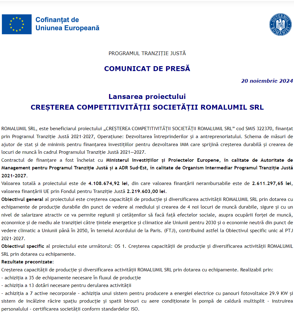 Comunicat de presă privind începerea derulării proiectului „CREȘTEREA COMPETITIVITĂȚII SOCIETĂȚII ROMALUMIL SRL” Comunicat de presă privind începerea derulării proiectului „Proiect de Investitii in Digitalizarea Companiei Globtrade Venture Investments. Dotari cu echipamente Hardware si Licente Software” Comunicat de presă privind începerea derulării proiectului „Accelerarea digitalizarii productiei si distributiei de filme pentru societatea SC STRADA FILM INTERNATIONAL” Comunicat de presă privind începerea derulării proiectului „ACHIZITII TEHNOLOGII PENTRU DIGITALIZAREA SC OMNIA IMPEX SRL” Comunicat de presă privind începerea derulării proiectului „Achiziție echipamente pentru digitalizare activitate în cadrul Aido Studio Design SRL” Comunicat de presă privind începerea derulării proiectului „DIGITALIZAREA SOCIETĂȚII DESTRES SLIME S.R.L.” Comunicat de presă privind finalizarea derulării proiectului „Dezvoltarea de capacități moderne de producere a materialului forestier de reproducere de către Kormos Silva SRL” Comunicat de presă privind începerea derulării proiectului „Digitalizarea societății IMASOFT STUDIO S.R.L.” Comunicat de presă privind începerea derulării proiectului „Digitalizarea societatii Lucas Weddings SRL” Pagina 86 din 215«Prima pagină‹Anterioară77787980818283848586878889909192939495‹Următoare »Ultima pagină Publică Anunţ