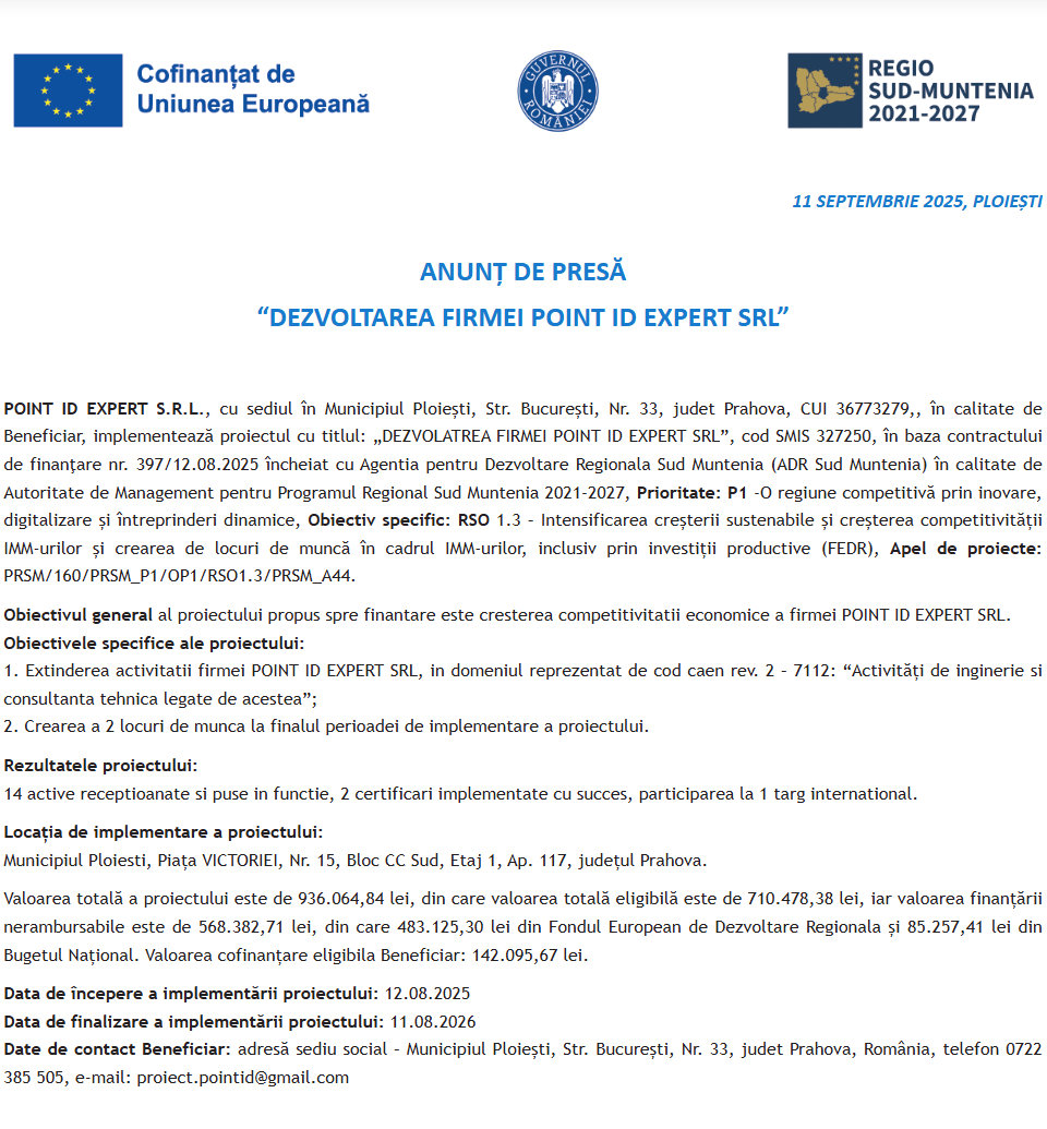 Comunicat de presă privind începerea derulării proiectului “Extinderea serviciilor SC MANDAS DENTAL SRL prin achizitia de echipamente” Comunicat de presă privind începerea derulării proiectului “DEZVOLTAREA CONART STRUCTURI ÎN DOMENIUL CAEN 4329 ALTE LUCRĂRI DE INSTALAȚII PENTRU CONSTRUCȚII”, cod SMIS 318074 Comunicat de presă privind finalizarea derulării proiectului „Digitalizarea firmei SoraMT prin achizitii de active corporale si necorporale”, cod MySMIS 317843 Comunicat de presă privind începerea derulării proiectului „Construire clinică stomatologică subsol parțial, parter, etaj 1 și împrejmuire teren” Comunicat de presă privind finalizarea derulării proiectului „,Digitalizarea companiei Darleot Group SRL prin achiziția de hardware și software performant”, cod MySMIS 319935 Comunicat de presă privind începerea derulării proiectului „DEZVOLTAREA FIRMEI POINT ID EXPERT SRL” Comunicat de presă privind finalizarea derulării proiectului „Digitalizarea intreprinderii DESIGN IDEAL SRL”, cod MySMIS 319454 Comunicat de presă privind finalizarea derulării proiectului „Digitalizarea intreprinderii DESIGN IDEAL SRL”, cod MySMIS 319454 Comunicat de presă privind finalizarea derulării proiectului „Digitalizarea intreprinderii DESIGN IDEAL SRL”, cod MySMIS 319454 Pagina 7 din 15123456789101112131415 Publică Anunţ