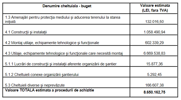 • Valoare estimată pentru achiziție, execuție, testare, punere in funcțiune conform Devizului general întocmit de către Proiectantul General în baza Studiului de fezabilitate realizat de către acesta: 8.650.162,75 lei, fără TVA;