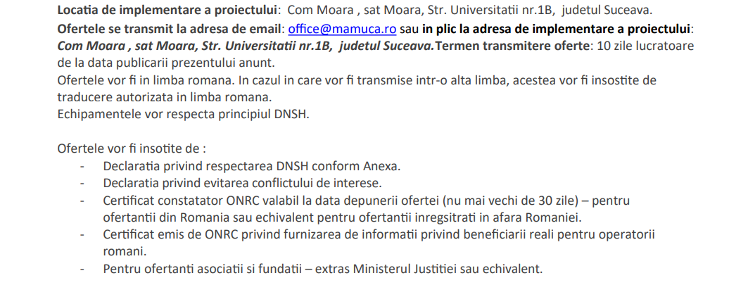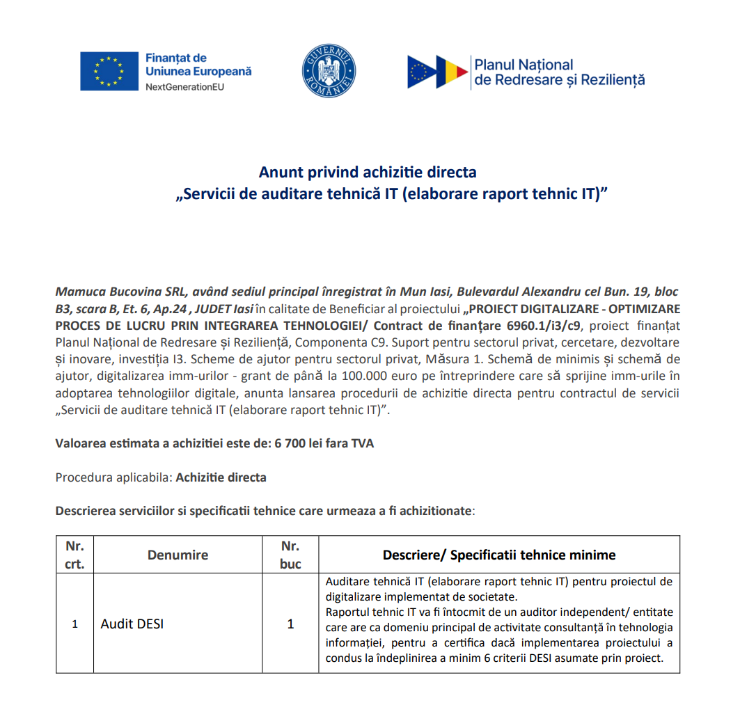 Data publicării: 23 iulie 2025 „Conținutul acestui material nu reprezintă în mod obligatoriu poziția oficială a Uniunii Europene sau a Guvernului României” „PNRR. Finanțat de Uniunea Europeană – UrmătoareaGenerațieUE” https://mfe.gov.ro/pnrr/ https://www.facebook.com/PNRROficial/ Publică Anunţ Program RegionalComunicat de presă privind finalizarea derulării proiectului „Achiziție echipamente performante pentru segmentul dentar în vederea îmbunătățirii competitivității microîntreprinderii DENTI SERVICE S.R.L.”PNRRComunicat de presă privind finalizarea derulării proiectului “DIGITALIZAREA SC GEOSOND SA ÎN VEDEREA CREȘTERII COMPETITIVITĂȚII PE PIAȚĂ”PNRRComunicat de presă privind începerea derulării proiectului „DIGITALIZARE IMM – OPTIMIZARE PROCES DE LUCRU PRIN INTEGRAREA TEHNOLOGIEI”PNRRComunicat de presă privind finalizarea derulării proiectului „DIGITALIZARE IMM – OPTIMIZARE PROCES DE LUCRU PRIN INTEGRAREA TEHNOLOGIEI”Fondul pentru ModernizareComunicat de presă privind începerea derulării proiectului „CONSTRUIRE CENTRALA ELECTRICA FOTOVOLTAICA (CEF) < 1 MW LA NIVELUL UAT COMUNA GĂLEȘTI, JUDEȚUL MUREȘ”Program RegionalComunicat de presă privind finalizarea derulării proiectului „Modernizarea si digitalizarea fluxului de productie la SC ASTRA TL SRL”Program RegionalComunicat de presă privind începerea derulării proiectului „Construire și dotare atelier de bijuterii „ARAH””PNRRComunicat de presă privind începerea derulării proiectului “Transformarea digitală a societății ARTISTIC DENT SRL pentru competitivitate și inovare” Publică Anunţ Anunţul anterior Anunţul următor