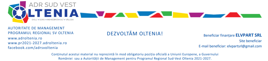 ELVPART SRL, cod de identificare fiscală 17859668 înregistrată la Registrul Comerțului cu nr. J2005000595189, cu sediul în Municipiul Târgu Jiu, strada Petresti, Nr.2B, Birou 1, Bloc 2B, Etaj Parter, cod postal -, Județul Gorj, România, deruleaza incepand cu data de 27.02.2026, proiectul „CONSTRUIREA, DOTAREA SI DEZVOLTAREA ELVPART SRL”, COD SMIS: 330986, in baza contractului de finantare incheiat cu Agentia pentru Dezvoltare Regionala Sud-Vest Oltenia, în calitate de Autoritate de Management pentru Programul Regional Sud-Vest Oltenia 2021-2027(AM PR SV Oltenia).